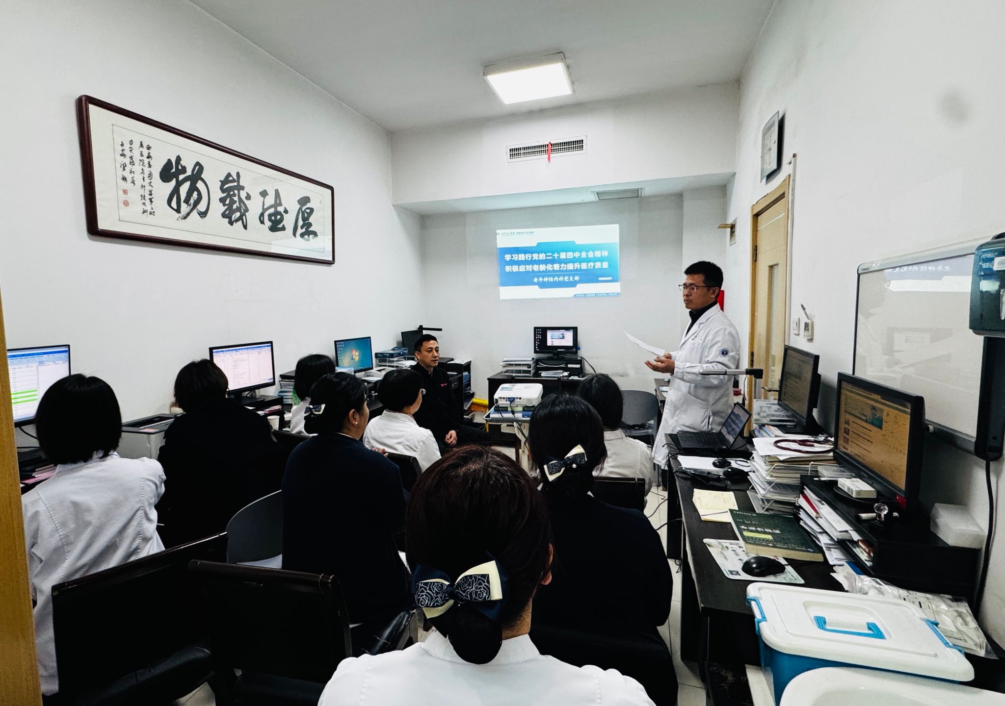 随后,支部书记张有友组织全体党员同志共同收看了“擘画新蓝图——坚持和加强党的全面领导”学习视频,学习之后结合科室工作实际,就贯彻落实二十届四中全会精神、提升老年神经内科医疗服务质量作出具体部署。他强调,应对老龄化挑战、提升医疗服务质效,核心在于“人才”与“服务”两大支撑。在人才队伍建设方面,科室将制定完善的人才培养计划,通过进修深造、学术交流、强化医护人员在老年神经疾病诊疗、老年综合征管理、多学科协作等领域的专业能力,打造一支技术精湛、结构合理的专业化团队,契合国家关于加强老年医学人才队伍建设的要求。在服务优化方面,科室将坚持以患者需求为导向,聚焦老年患者“急难愁盼”问题,完善老年综合评估服务体系,优化诊疗流程,关注老年人心理健康与功能维护,推动医疗服务从“疾病治疗”向“健康管理”延伸,让老年患者获得更具温度、更具精准度的医疗服务。会上,全体参会人员围绕会议主题展开热烈讨论,大家纷纷表示,将以此次会议为契机,深入学习领会二十届四中全会精神,把学习成果转化为履职尽责的实际行动。党员同志将主动发挥先锋模范作用,在技术攻关、服务创新、科普宣传等方面走在前、作表率,推动科室形成“党建引领业务、业务彰显党建”的深度融合格局。