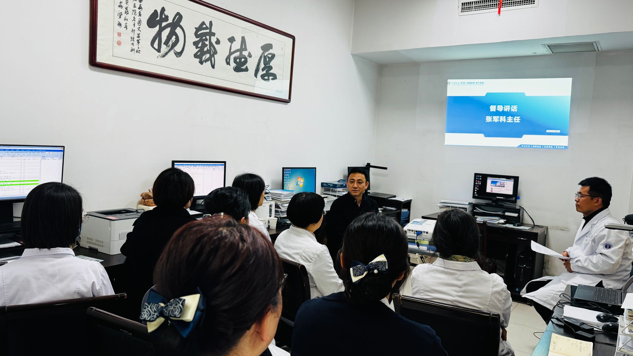 会议伊始,张军科主任就围绕党的二十届四中全会精神专题学习做开场致词。他指出二十届四中全会对卫生健康事业高质量发展作出系列部署,与推动健康中国建设和积极应对人口老龄化的国家战略高度契合,为医疗单位未来发展规划指明了行动方向。他强调老年神经内科作为老年健康服务的前沿阵地,必须将思想和行动统一到党中央决策部署上来,以党建为统领筑牢发展根基,将制度优势转化为医疗服务效能。他要求老年神经内科党支部全体党员要继续强化责任担当,严守医德医风底线,在诊疗服务中践行“人民至上、生命至上”的理念,以实际行动回应群众对老年医疗服务的新期待。