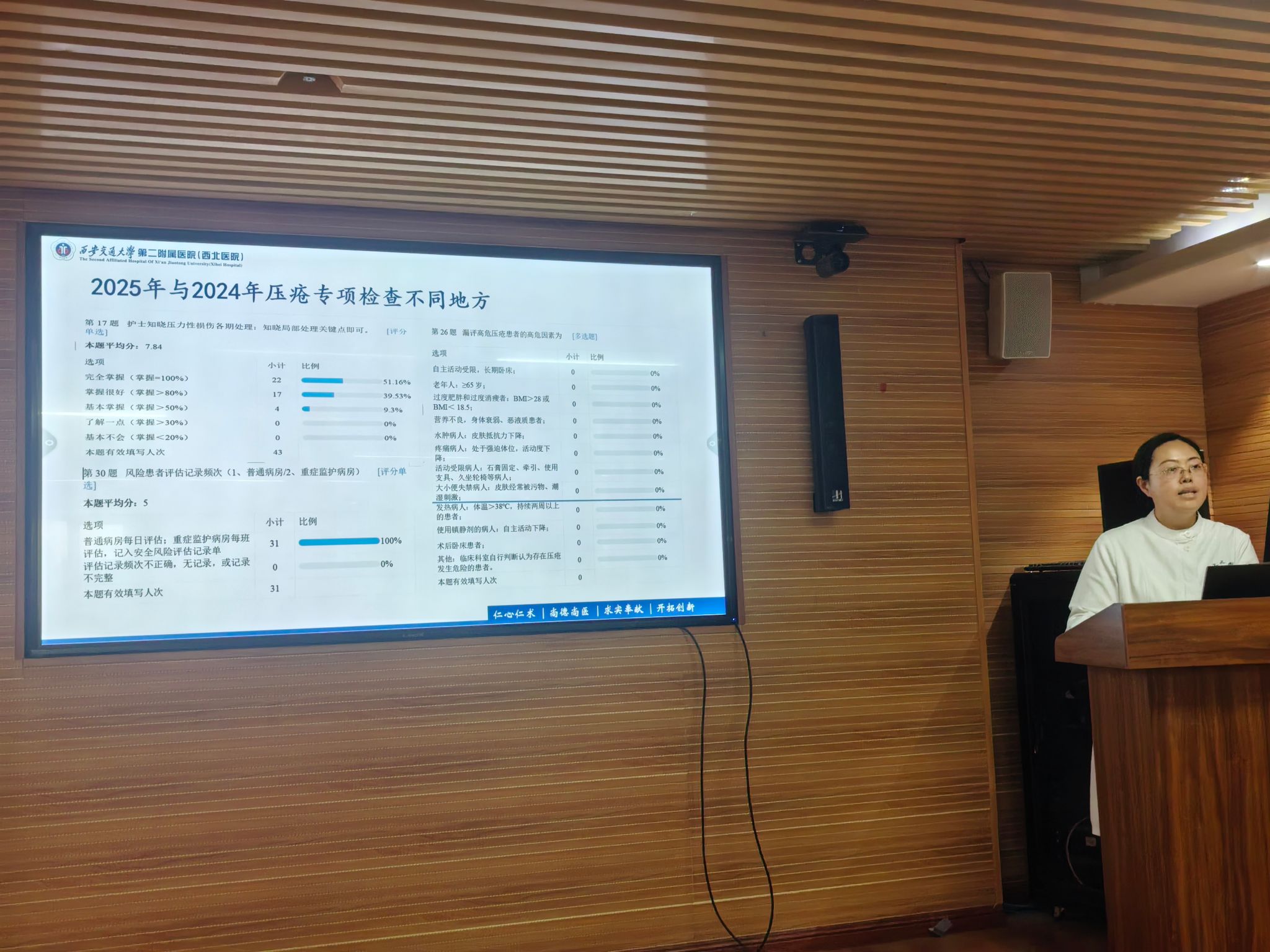 最后,陈娟副护士长作2025年小组活动总结暨2026年活动安排部署。总结中提到,2025年专科小组完成90%年度工作任务,亮点纷呈:创新分季度开展压疮、伤口、造口失禁专场培训,开展“世界压疮预防日”科普义诊,编写《老年皮肤照护实用指导手册》,承办省级专科护士实践基地并完成10名学员带教;同时也指出了压疮分期与不良事件分级衔接不熟练、科普宣教覆盖面不足等问题及对应整改对策。此外,陈娟老师还明确了2026年小组工作计划,包括开展压力性损伤识别工作坊、制作压疮知识题库、完成压疮横断面调查、举办造口疑难病案观摩及专科知识竞赛等系列活动,核心围绕“降低院内压疮发生率、提高上报准确率、提升专科护理能力”推进工作。