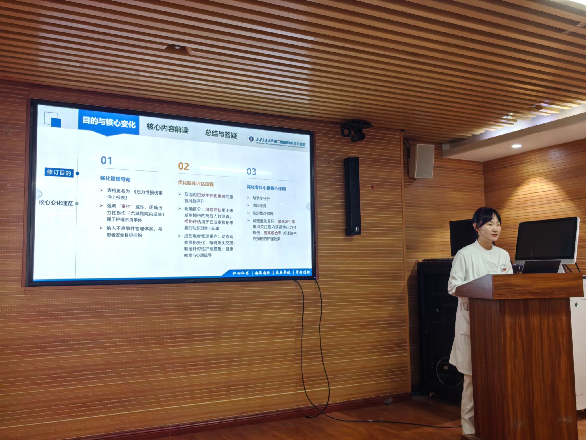 随后,刘颖主管护师对《压力性损伤管理制度-2026.2》进行简要解读并收集临床问题反馈。重点讲解了制度修订的核心变化,包括将院内压力性损伤纳入护理不良事件管理、取消已损伤患者重复风险评分、按人群适配Braden、Braden-QD、Waterlow’s等评估工具、明确上报流程及时限等内容,同时针对临床应用中的疑问进行现场解答,推动制度更贴合临床实操落地。