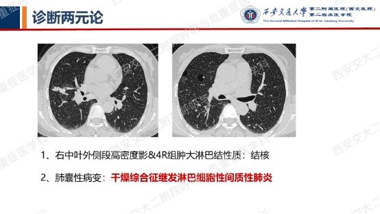 患者呼吸道症状并无太多特异性,还是从影像资料入手,右肺中叶外侧段高密度灶并纵隔及右肺门淋巴结肿大,同时存在双肺多发囊性病变,一元论?多元论?