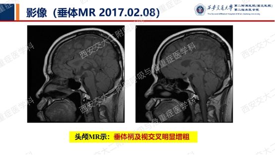 综合以上病史和资料,患者多尿多饮并干咳、胸闷、气短,反复气胸,尿比重低下,激素水平异常,胸部CT提示“肺间质改变、多发囊性病变”,垂体MR增强提示“垂体柄增粗并强化不均匀”,最终诊断:多系统朗格汉斯细胞组织细胞增生症(MS-LCH)。