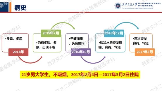 这名大学生起先的症状是多饮多尿,时隔2年才出现呼吸系统症状——干咳,后反复胸闷、气短。胸部CT提示“两肺呈淡薄片状磨玻璃改变,同时可见多发类圆形无肺纹理透亮区”,后并发气胸,气胸好转后再复查胸部CT,提示“双肺弥漫性间质改变,双肺多发空腔性病变,较前进展、部分融合”。