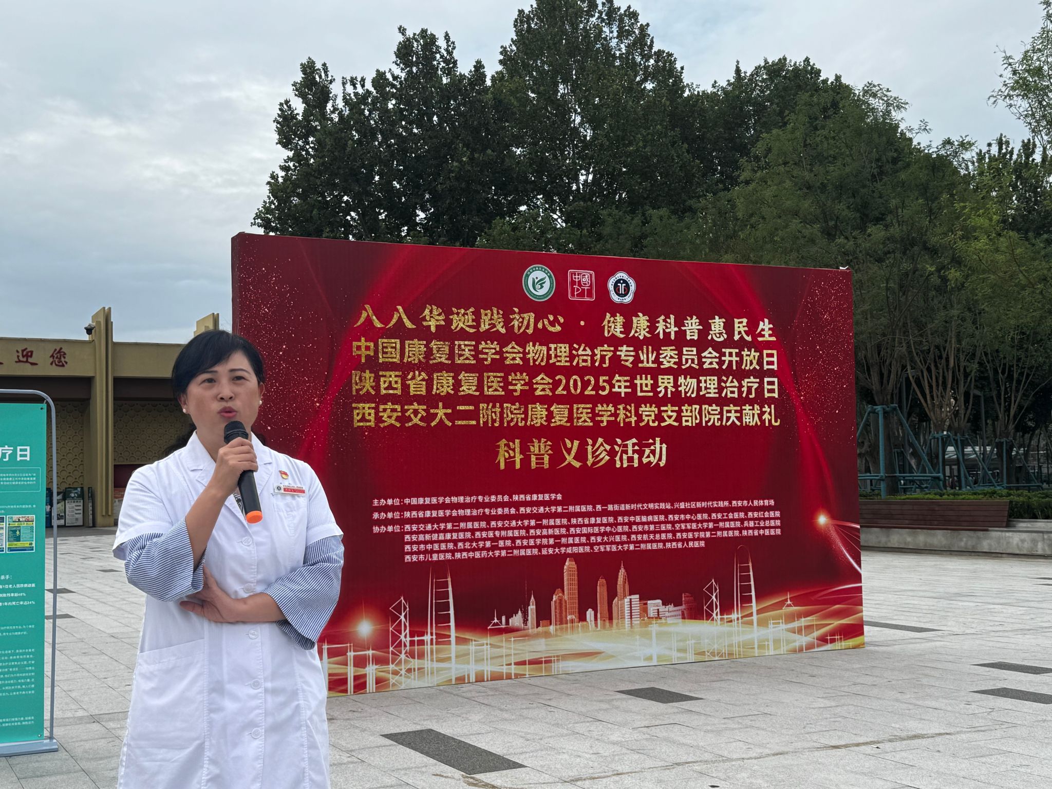 活动伊始,科室党支部组织委员雷晓辉同志主持活动开幕式,并介绍了活动背景和准备情况。随后支部书记袁海峰教授同时代表陕西省康复医学会对本次活动的开幕表示祝贺,对积极参与我院八八华诞献礼活动的各位康复同道表示欢迎。活动正值9月8日世界物理治疗日来临之际,对所有康复同仁表达深深的节日祝福。然后支部宣传委员、康复医学科主任乔鸿飞教授代表医院和科室进行了致辞,她表示西安交通大学第二附属医院诞生于民族危难之际,已走过八十八年的光辉历程,正值八八华诞之际,我们康复医学科作为我省康复医学会理事长单位,积极发挥学科优势和支部组织力,在即将到来的世界物理治疗日前一天,组织本次惠民活动,意义非凡,擦亮了我们“西交二附院”的康复品牌,彰显了我们党员同志的责任担当。
