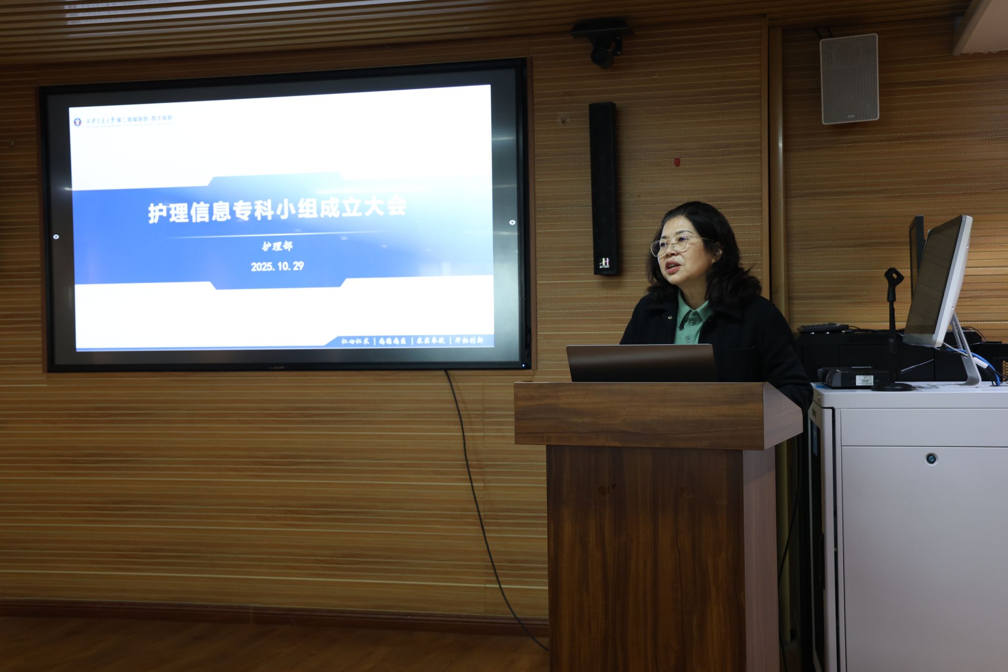 杨惠云主任为大会致开幕辞。她首先对小组的成立表示热烈祝贺,并指出,信息系统的持续优化,其根本动力和智慧源泉始终来自于临床一线的医护同仁。她希望小组的成立能够为未来申报信息相关科研项目、促进资源共享、开阔管理思路提供关键平台,并为护理专业的精细化、智能化发展提供坚实的技术支撑。