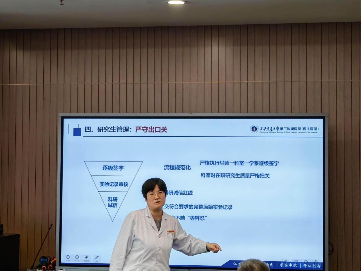 在总结发言中,付荣国主任特别强调了住培工作的改革重点。她指出,要深化绩效制度改革,尽快制定并落实住培教学绩效核算与分配实施细则,将带教工作量与教学质量有效纳入绩效考核体系,充分发挥绩效管理的激励和导向作用,调动教师参与住培工作的积极性。同时对教学工作提出明确要求:第一,要进一步强化教学管理,建立健全教学纪律长效机制,确保教学工作规范有序开展;第二,要全面提升研究生培养质量,特别要加强在职研究生的全过程管理,严格执行从导师、科室到学系的逐级审核制度,确保人才培养质量;第三,要强化学术规范建设,完善实验记录等过程管理机制,营造严谨求实的学术氛围。