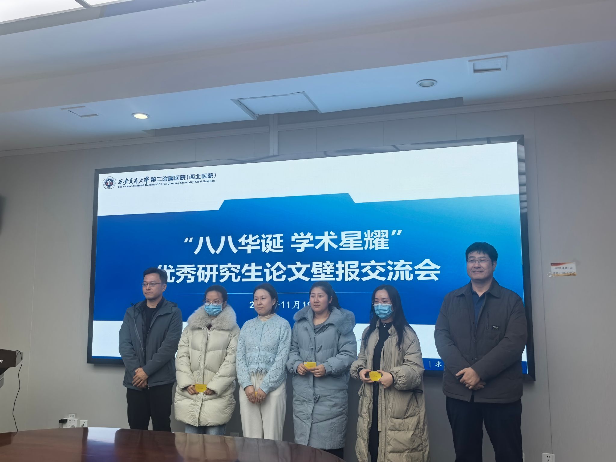 2025年11月19日下午5点,我院在宗濂会议室举办“八八华诞 学术星耀”优秀研究生论文壁报交流会。医院党委办公室主任赵振峰,科研中心实验室党支部书记、副主任武坤毅,生物诊疗中心副教授刘朋飞,优秀研究生论文壁报获奖学生代表及学生工作部全体工作人员参加。会议由学生工作部主任吕晔主持。