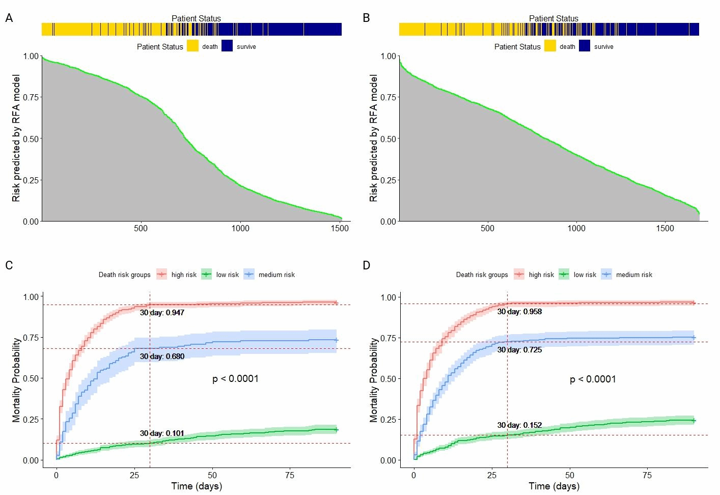 图2.慢加急性肝衰竭患者30天死亡率的预测性能。(A)CBA模型预测死亡率与实际生存状态的比较。(B)RFA模型预测死亡率与实际生存状态的比较。(C)按CBA模型预测分类的慢加急性肝衰竭患者30天死亡概率。(D)按RFA模型预测分类的慢加急性肝衰竭患者30天死亡概率。