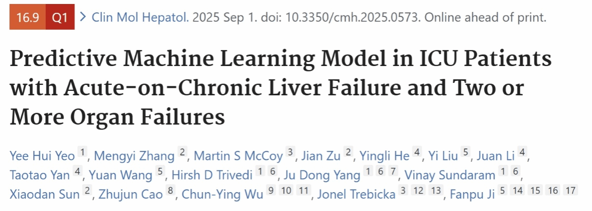 [1] Yeo YH, Zhang M, McCoy MS, Zu J, He Y, Liu Y, Li J, Yan T, Wang Y, Trivedi HD, Yang JD, Sundaram V, Sun X, Cao Z, Wu CY, Trebicka J, Ji F. Predictive Machine Learning Model in ICU Patients with Acute-on-Chronic Liver Failure and Two or More Organ Failures. Clin Mol Hepatol. 2025 Sep 1. doi: 10.3350/cmh.2025.0573. Epub ahead of print. PMID: 40889809.