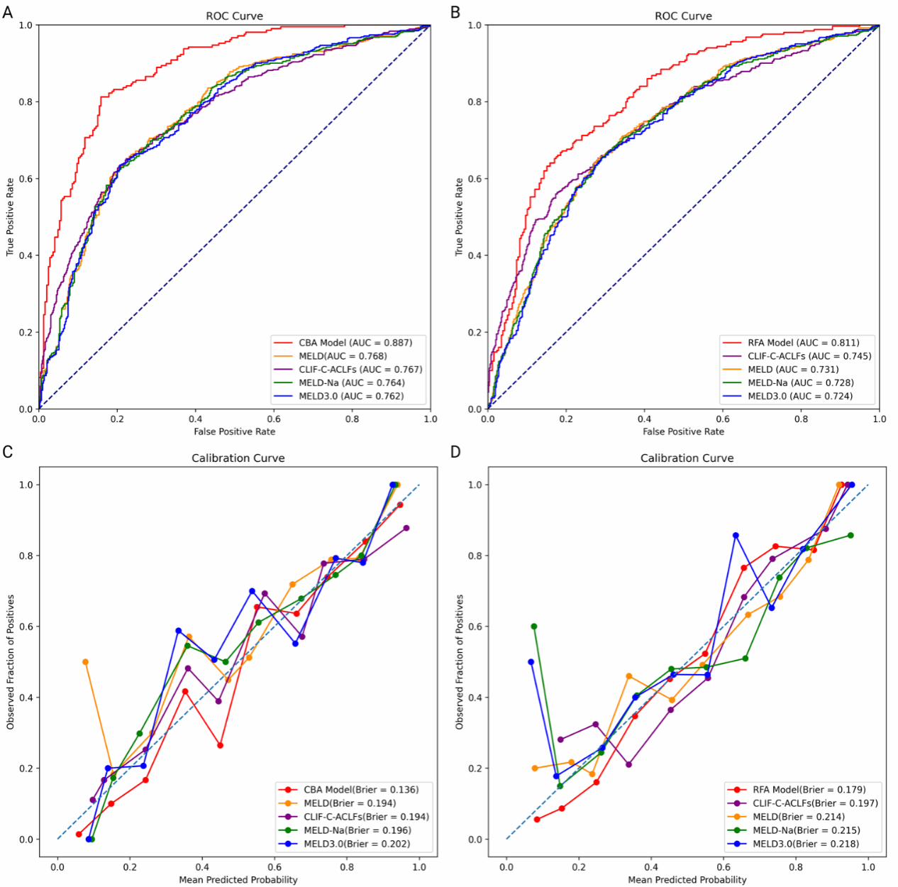 CBA模型和RFA模型在各自队列中预测30天死亡率的AUC值均显著高于传统预测模型(MELD、MELD-Na、MELD 3.0及CLIF-C ACLF评分),与传统模型(包括CLIF-CACLF(AUC=0.767和0.745)和MELD3.0(AUC=0.762和0.724))相比,CBA(0.887)和RFA(0.811)模型均显示出明显更高的AUC值。(图3)
