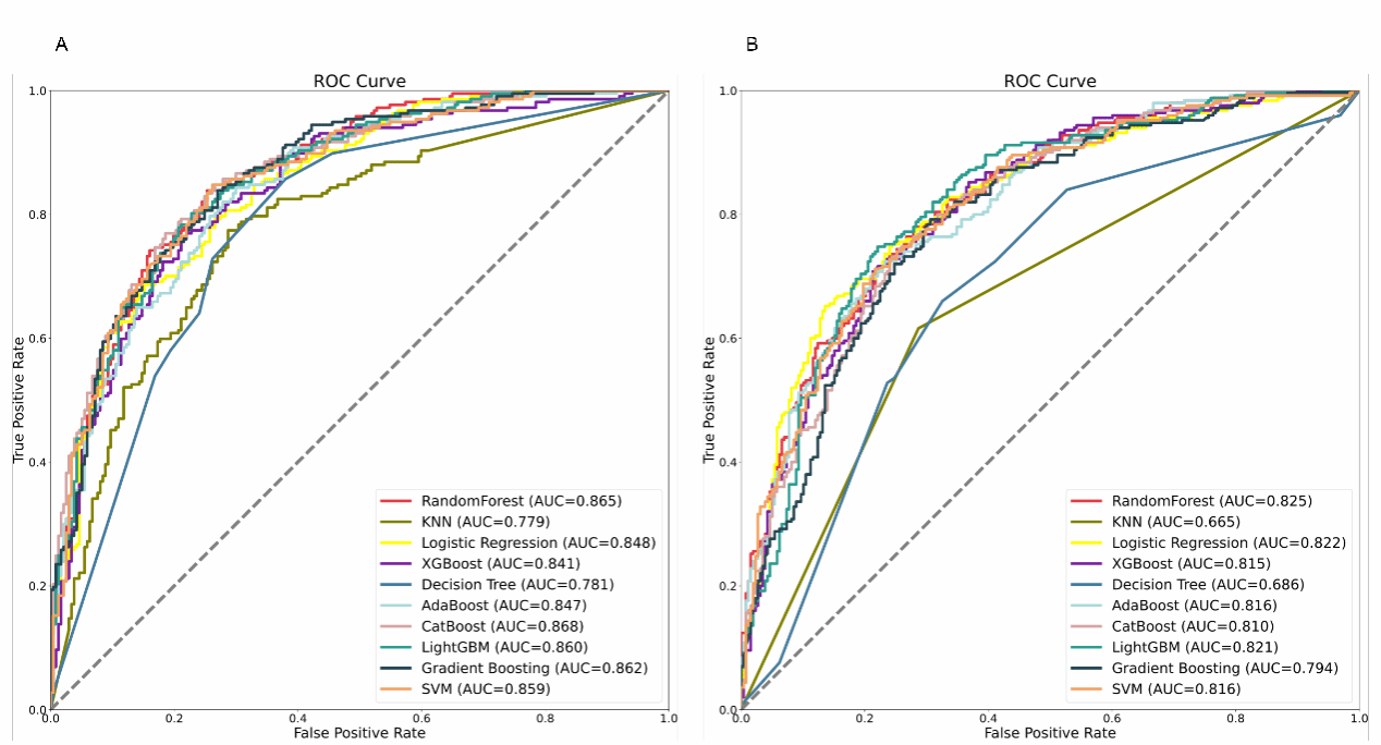 图1.机器学习模型的预测ACLF患者短期死亡风险的ROC曲线。(A) 在NACSELD定义的ACLF队列。(B)在EASL-CLIF定义的ACLF队列。