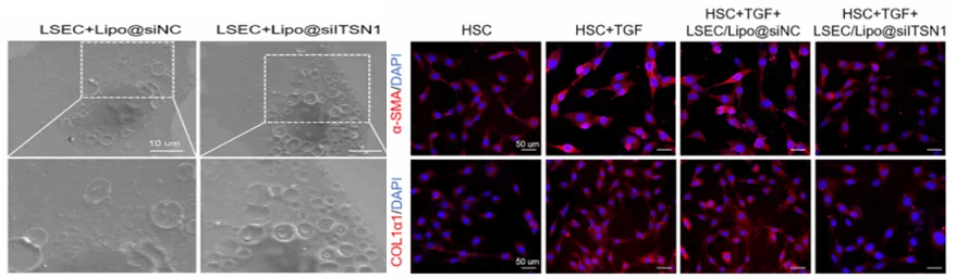 利用脂质体转染技术抑制LSECs中ITSN1 mRNA,然后观察其对共培养中LSECs分化和hsc活化的影响。开发基于防御素的ITSN1 siRNA递送系统(RC100@siITSN1),并评估其在体内的安全性和靶向效率,同时评价RC100@siITSN1在CCL4诱导的肝纤维化模型中的治疗效果。