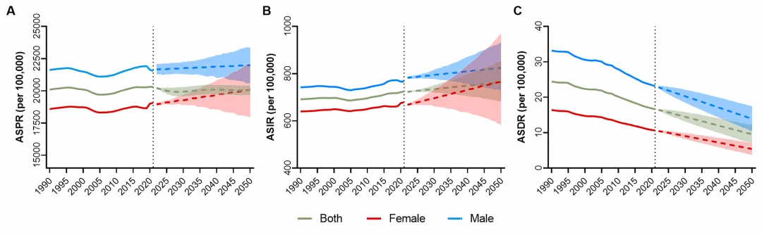 图2. 1990年至2021年全球慢性肝病的ASPR、ASIR和ASDR,并预测至2050年,总体以及按性别分组