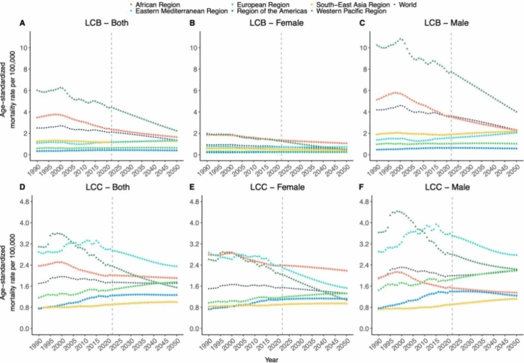 图1. 1990-2050年WHO六个区域LCB/LCC相关ASMR的时间趋势