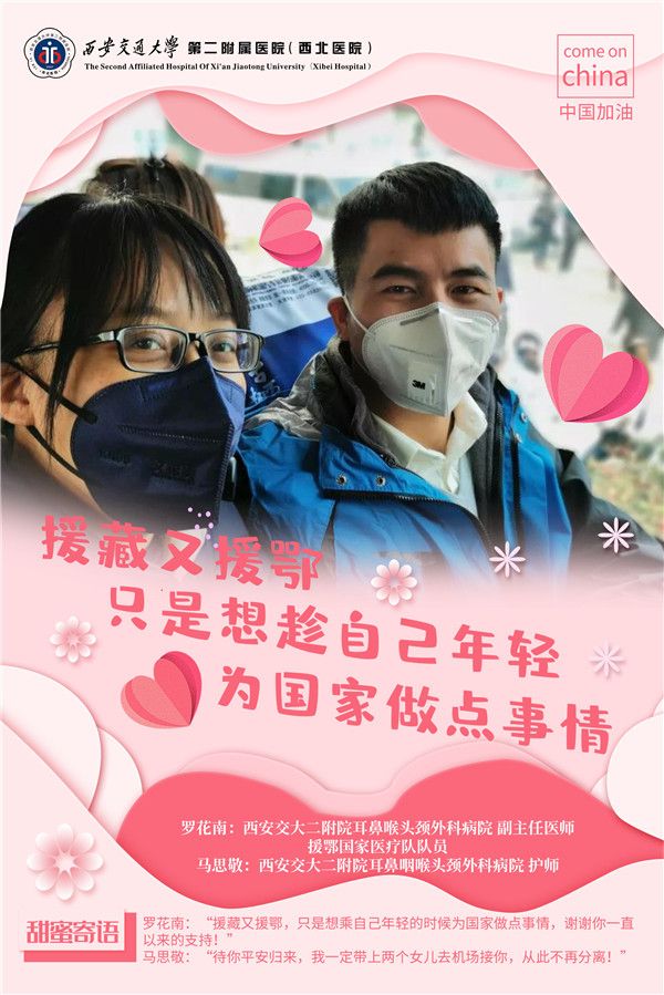 罗花南(耳鼻咽喉头颈外科病院 副主任医师、陕西省第四批组团式援藏医疗队、援鄂国家医疗队队员,2月8日前往武汉华中科技大学同济医院中法新城院区) 妻子:马思敬(耳鼻咽喉头颈外科病院 护师) 罗花南:“援藏又援鄂,...
