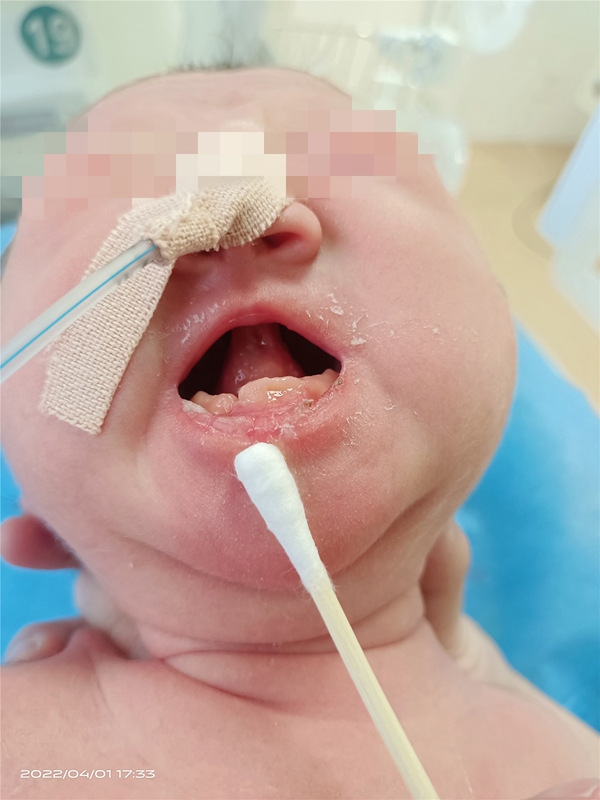 4月1日,我院新生儿病区收治一位来自外省出生仅三天的患儿,患儿的病情让所有在场的医护人员感到意外。 患儿的舌尖粘连于上牙槽上,避开舌体可见腭裂,鼻梁低平,右手大拇指指甲缺失,左脚第二三脚趾之间粘连。最让人揪心的是,...