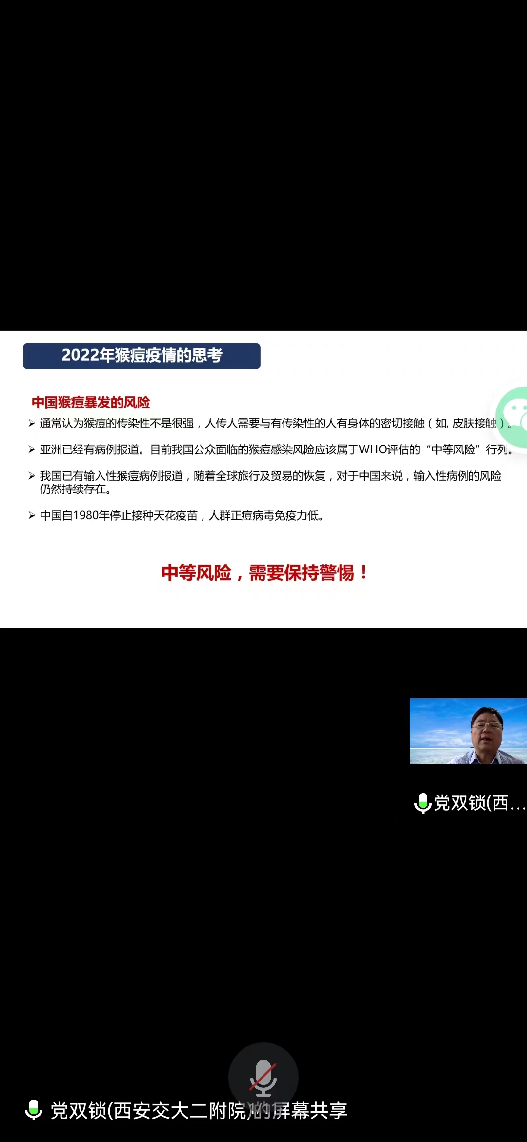 2022年9月21日下午,医务部组织召开了医疗质量安全培训。本次培训通过腾讯会议在线直播的形式进行,邀请了感染科党双锁主任和输血科韩梅宁主任,全院各科室共近100名医师代表参加。 党双锁主任讲解的内容为猴痘的诊断与治疗,...