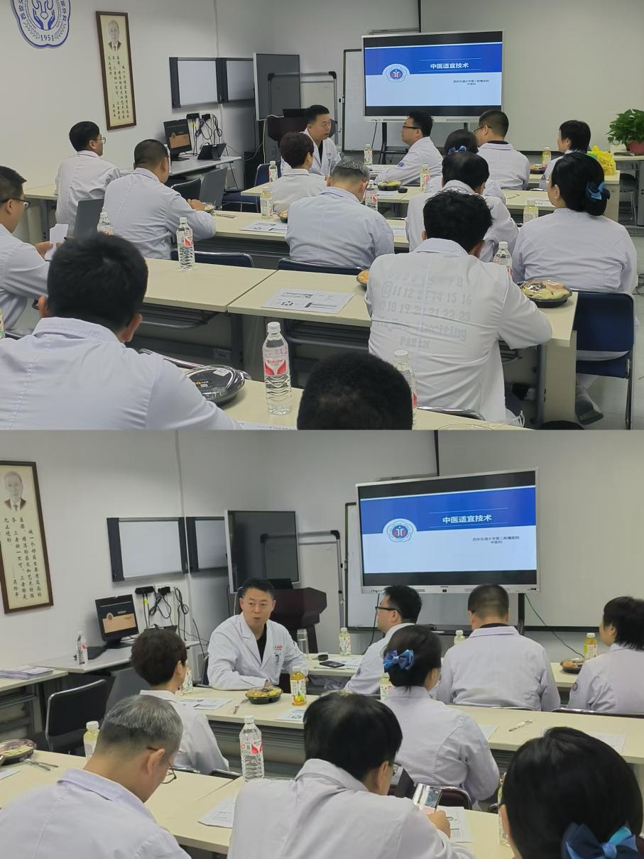 与此同时中医科安鹏副主任对泌尿外科联合中医查房的目的及重要性进行了阐述,强调了中西医结合在现代医疗领域的广阔前景以及对于提升泌外手术疗效、促进患者术后康复的潜在优势。吴仲恒副主任表示中医适宜技术在泌尿外科术后功能康复中发挥着重要作用。之后由中医科张涛医生就泌尿外科相关疾病的中医适宜技术和诊疗特色作简要介绍。杨海侠护士长鼓励护士们积极参与中医技术的学习与实践,不断提升自身专业素养,以便更好地将中医技术融入日常护理工作中,为患者提供更优质、多元化的医疗服务,助力中西医结合诊疗模式在临床工作中发挥更大的作用。讨论环节,大家结合以往的临床案例以及相关研究成果深入交流了中医适宜技术与泌外手术相结合的思路与方法。在此基础上,两个科室共同制定了中医技术在泌尿外科具体开展的预案,为后续的深入合作奠定了坚实的基础。讲座结束后,中医科的专家们与薛力主任、李峰医生一起联合查房,通过望闻问切、辨证施治,开具个性化的中医药处方及适宜技术等治疗方案。
