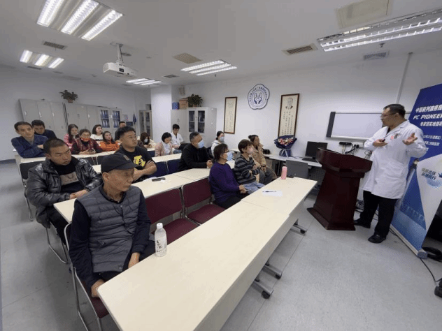 泌尿外科副主任付德来教授介绍泌尿外科作为国家重点学科、临床重点专科,在创建国家医学中心的道路上,时刻紧跟国内外专科发展的前沿步伐,不断提升疑难复杂病例的解决能力。近年来在亚专业建设、微创技术创新等方面取得的成绩,肾肿瘤亚专业的肿瘤筛查、达芬奇机器人手术、射频消融术日渐成熟,医护一体化和全程化的管理理念特色鲜明,受到业界广泛认可,也获得众多患者的好评。在授课环节他以通俗易懂的科普形式从肾肿瘤筛查、早期治疗方法、生活指导等方面为患者及家属深入浅出的讲解,病友们听得非常投入,不时记下关键信息。