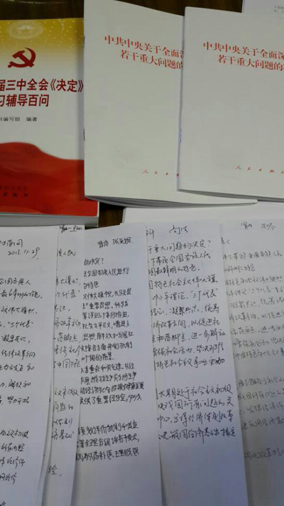 会上大家结合身边发生的事,积极发言和探讨。会后就此次学习做了简单的知识竞赛,大家踊跃回答。通过此次学习,加深了大家对党的第十八大三中全会会议精神的理解。