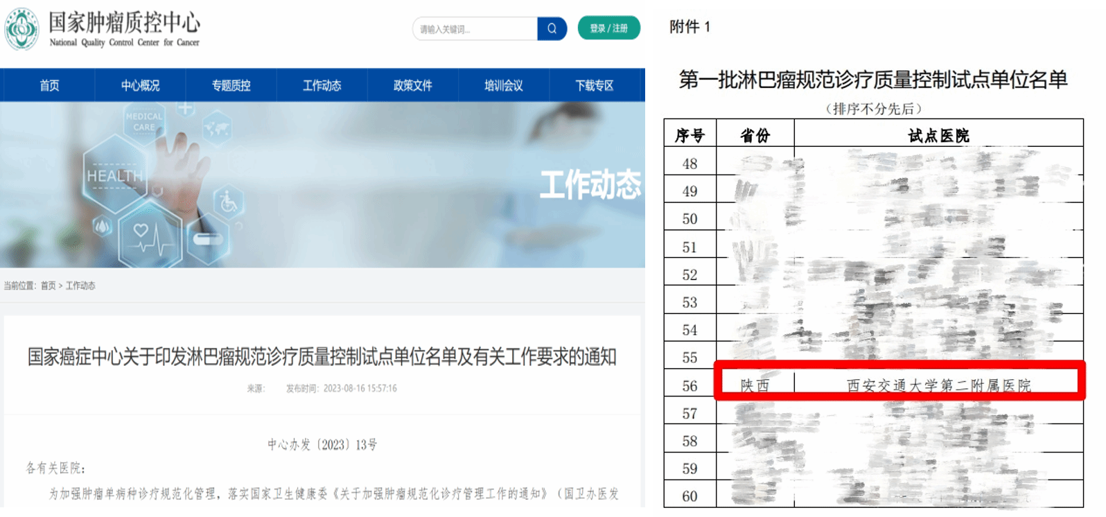 为加强肿瘤单病种诊疗规范化管理,2022年国家癌症中心印发《关于开展淋巴瘤规范诊疗质量控制试点工作的通知》,开展了淋巴瘤规范诊疗质量控制试点遴选工作。经过专家委员会对申报材料的评审,8月16日国家癌症中心印发通知,公布了第一批淋巴瘤规范诊疗质量控制试点单位名单及有关工作要求,其中西安交通大学第二附属医院血液科成功入选,成为首批“淋巴瘤规范诊疗质量控制试点单位”之一!
