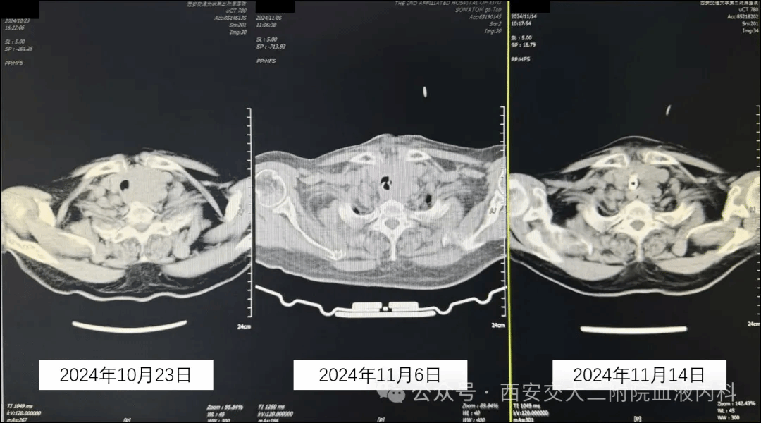 收住入院后患者憋气症状进行性加重,康全清教授、侯瑾教授及闫妍医生团队紧急组织病历讨论,为缓解症状急诊行暂时性气管切开并穿刺组织送病理会诊,结果出乎大家意料并非甲状腺肿瘤,而是较为罕见的经典型霍奇金淋巴瘤。病理结果回报后侯瑾教授立即与血液科曹星梅教授、古流芳教授取得联系,组织MDT讨论,考虑霍奇金淋巴瘤对化疗敏感,手术并非常规治疗选择,屈奶奶很快便转入了血液内科二病区继续治疗。曹星梅教授、古流芳教授及张亦琳医师充分评估患者病情,超高龄老年患者脏器储备功能不足、化疗耐受差、易出现严重骨髓抑制、合并严重感染等问题,但面对这个“卡脖子”的大家伙,一味减低剂量可能很难缓解屈奶奶的症状,最终讨论决定减低化疗剂量的同时加用ADC药物平衡疗效与副作用,同时在医护、临床营养科等相关科室的共同努力下,屈奶奶的憋气症状很快得到改善,目前已能正常吃饭、喝水了,夜间休息也有明显改善,CT检查提示肿物明显回缩,本周期治疗结束就可以回家休息一段时间了。