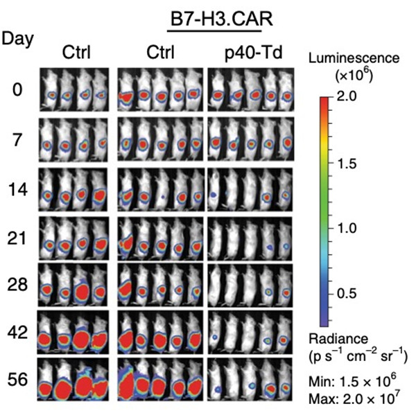 本研究描述了作用于CAR-T细胞新型的细胞因子系统p40/IL23。相比之前所有研究体系,p40/IL23细胞因子系统在抗癌功能上更加优秀,同时具有更高的安全性。此研究将开辟实体瘤的免疫治疗新领域,具有极高的临床应用价值,目前已申请相关专利,并积极进行临床试验前准备工作。