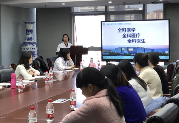 全科医学科主任并全科专业基地负责人赵晓静为大家诠释了全科医学、全科医疗及全科医生的定义及具体内容,通过举例体现全科专业“以人为中心、以家庭为单位,以社区为范围、以预防为导向”的全科特色;教学秘书李静结合糖尿病基层管理指南,为大家阐述了糖尿病诊断与转诊、糖尿病的治疗及基层糖尿病患者的管理三方面的内容;2017级全科住培医师兰玲娟结合自身临床轮转经历,以”做一个Face现自信的全科医生”为题进行分享。