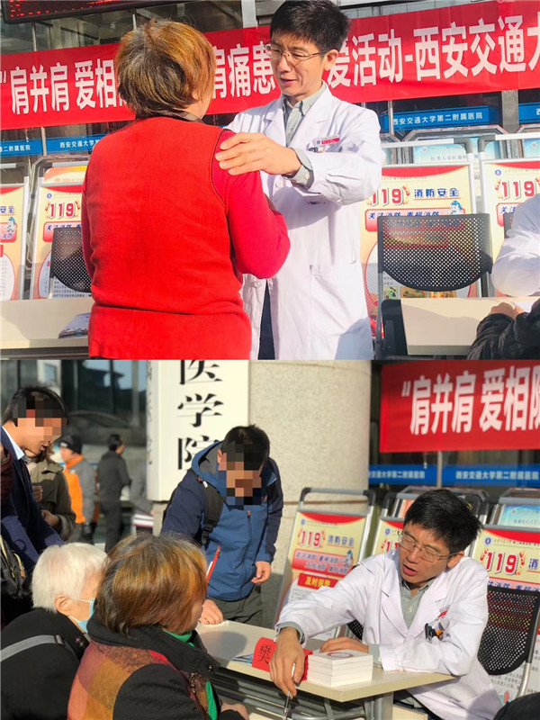 什么是肩袖损伤?肩关节疼痛等于肩周炎吗?该如何治疗呢?为了提高公众对肩关节疾病的认知,改善肩痛疾病发病率高、认知度低、误区多、正确治疗率低的现状,中华医学会运动医疗分会拟将每年11月定为“全国爱肩月”,由主委单位复旦大学附属华山医院牵头,举办首届“肩痛患者关爱义诊活动”,并将我院设为陕西分会场。 2019年11月13日,西安交通大学第二附属医院骨科运动医学团队成功举办“爱肩月”患者教育及关爱义诊活动,现场人头攒动,秩序井然,很多患者都是专程来参加义诊活动。