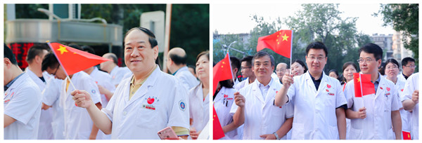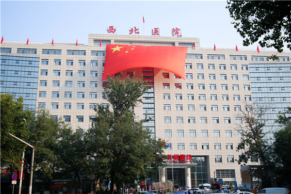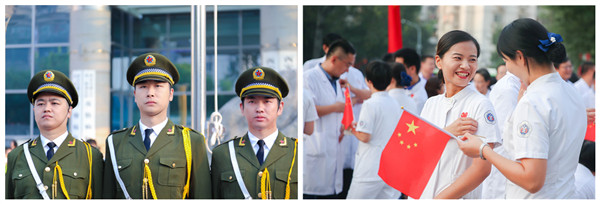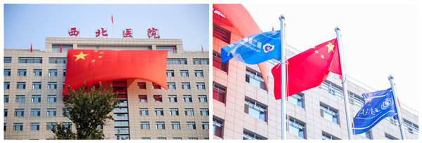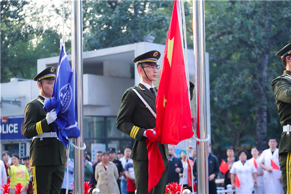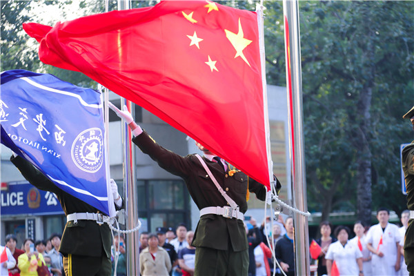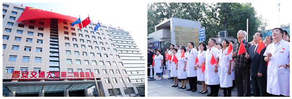 “五星红旗迎风飘扬,胜利歌声多么响亮,歌唱我们亲爱的祖国,从今走向繁荣富强……”升旗完毕,在场人员合唱《歌唱祖国》,同时,一面巨大的国旗从门诊综合住院大楼上缓缓落下,五星红旗飘扬在蔚蓝的天空,嘹亮的歌声响彻整个医院,挥舞的小红旗唤起中华儿女的自豪和向往。二附院人用歌声唱响对祖国的无限祝福、对卫生健康事业的赞美,全体医务工作者也必将不忘医者初心,德艺双修,教书育人,科研兴院,服务师生,服务社会,用过硬的本领满足人民群众对健康生活的美好向往,为实现中华民族伟大复兴的中国梦提供强有力的健康保障,在平凡的岗位上奏响新时代奋斗之歌,用我们的行动为国旗增辉。