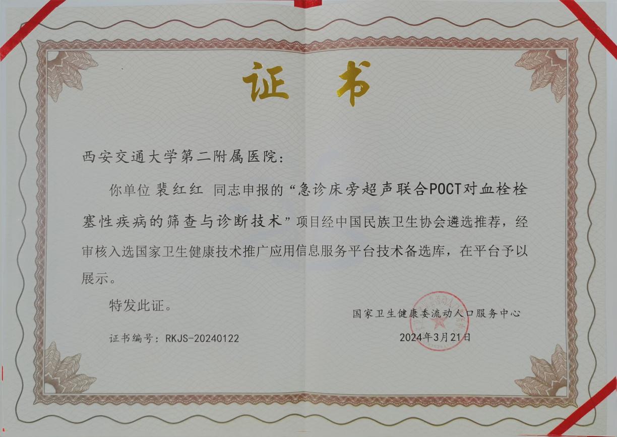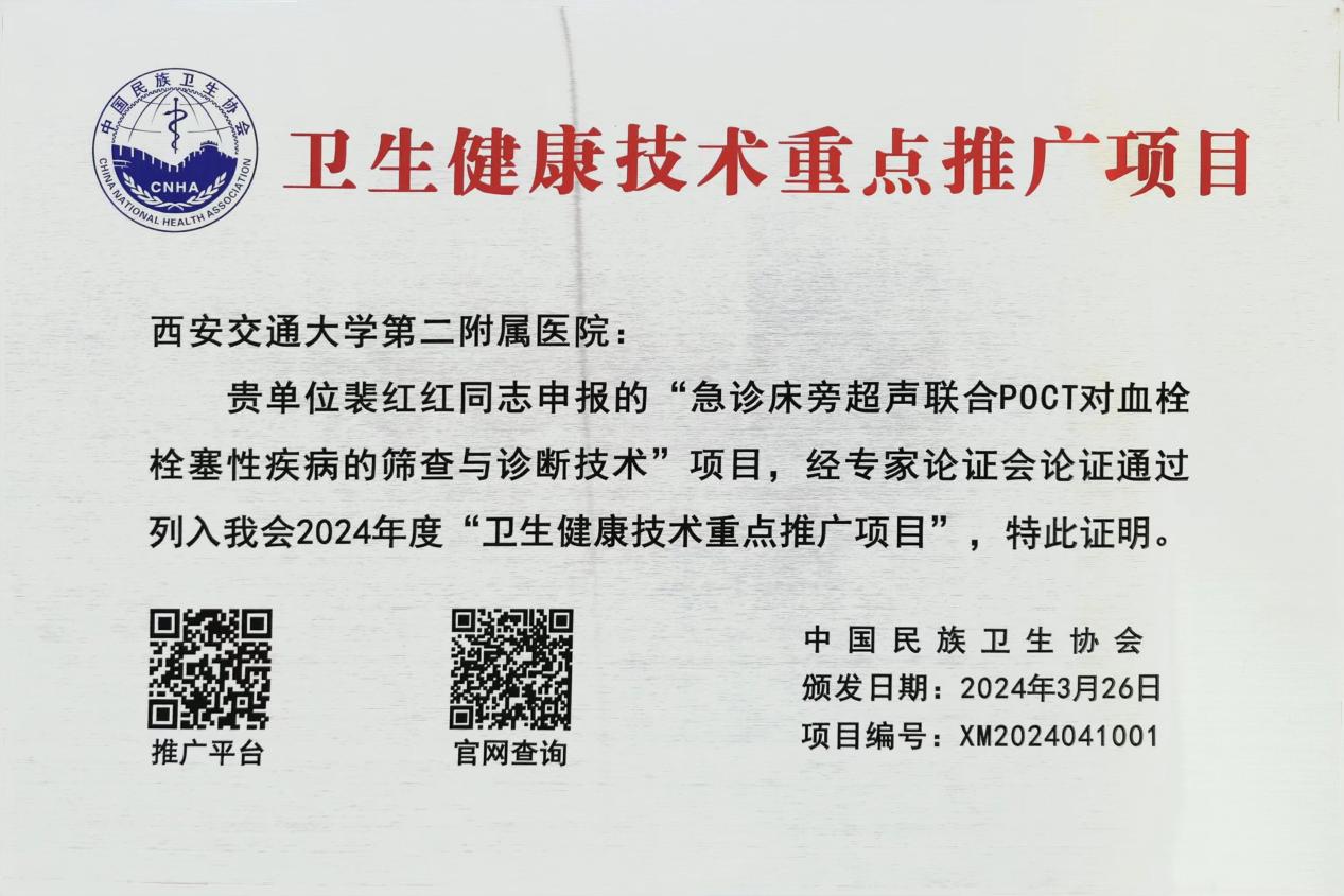 近日,由我院急诊科裴红红主任主持申报的“急诊床旁超声联合POCT对血栓栓塞性疾病的筛查与诊断技术”国家卫生健康技术推广项目已经通过专家论证会论证,被列入中国民族协会“卫生健康技术重点推广项目”,同时该项目通过了国家卫健委流动人口服务中心审查,并由中国民族卫生协会遴选推荐,成功入选国家卫生健康技术推广应用信息服务平台技术备选库。