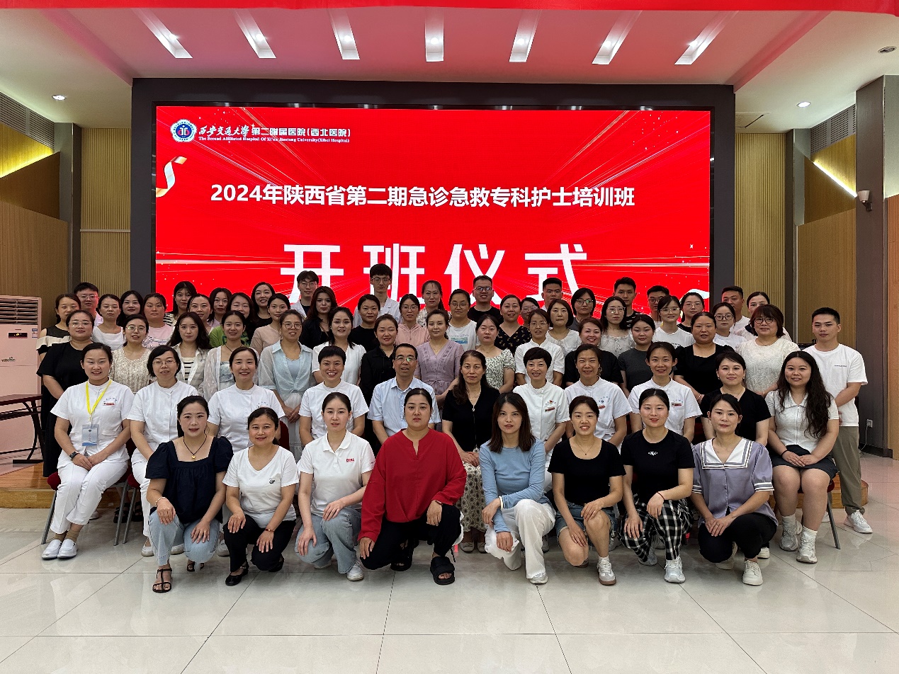 2024年7月31日,由陕西省卫健委主办,西安交通大学第二附属医院急诊科承办的“2024年陕西省第二期急诊急救专科护士培训班”隆重开班。开班仪式由急诊科护士长柏玲主持,西安交通大学第二附属医院护理部孔德玲副主任、姚聪副主任、急诊科裴红红主任、急诊科护士长赵丽、急诊科护士长邱晓娟、急诊科护士长邬媛,以及54名来自各大医院的优秀骨干学员共同参加了此次开班典礼。