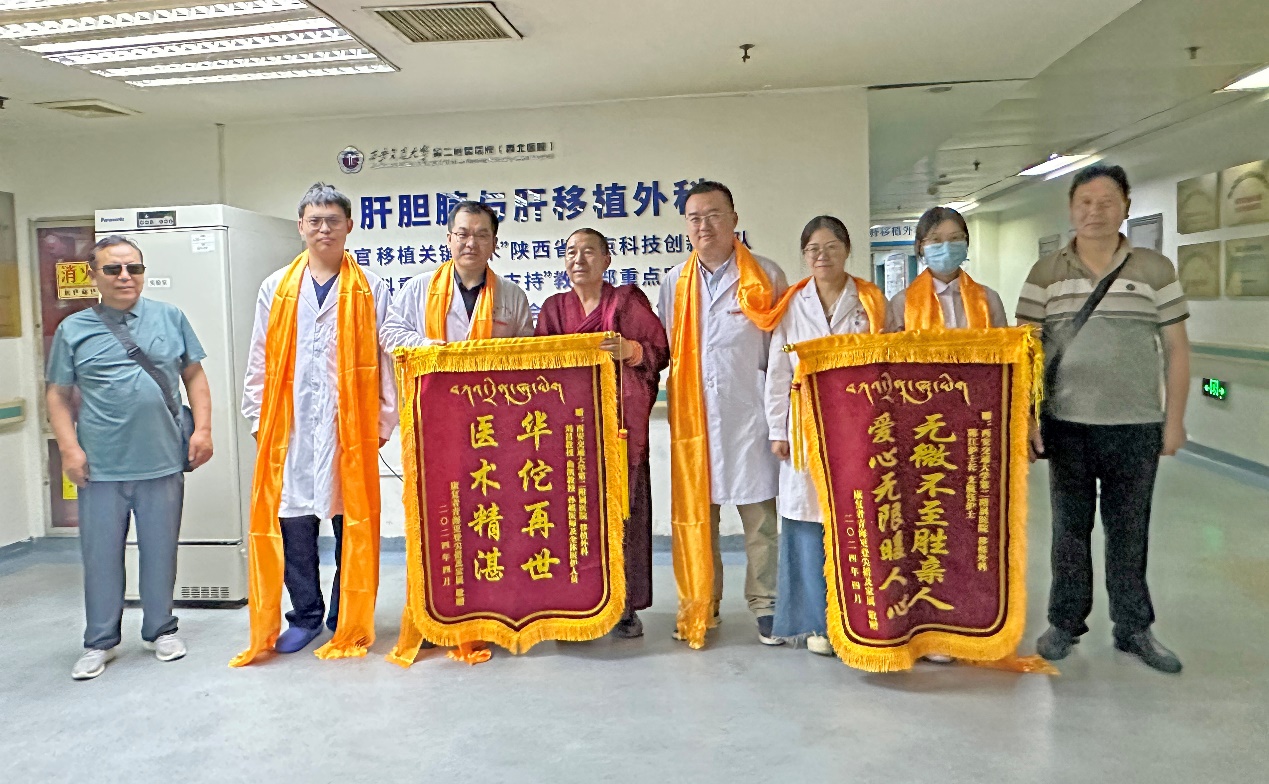 短时间来了三位泡型肝包虫患者,刘昌教授和曲凯副教授高度重视,充分了解患者病情,认真评估手术风险。其中,藏族患者更登大叔因为不懂汉语,在沟通时需要倾注更多耐心。经过缜密的术前准备,手术团队与麻醉、护理团队通力合作,三例手术均顺利完成。患者术后恢复良好,一周后顺利出院。出院时患者为移植外科医护送上了代表尊敬与感激的金色哈达以及感谢锦旗,表示真挚的感谢和衷心的祝福。