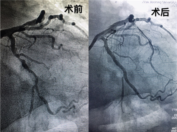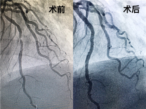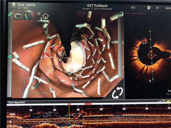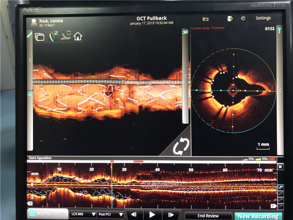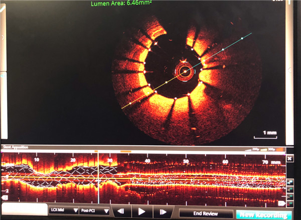 经过手术团队对图像缜密的研究,为患者右冠脉和左冠脉回旋支植入冠脉支架,血流恢复TIMI 3级,手术耗时一小时余。术后患者症状逐渐减轻,焦虑的情绪渐渐平复。至此,由邓捷主任带领的冠脉团队成功完成我院首例OCT指导下冠脉支架植入术。