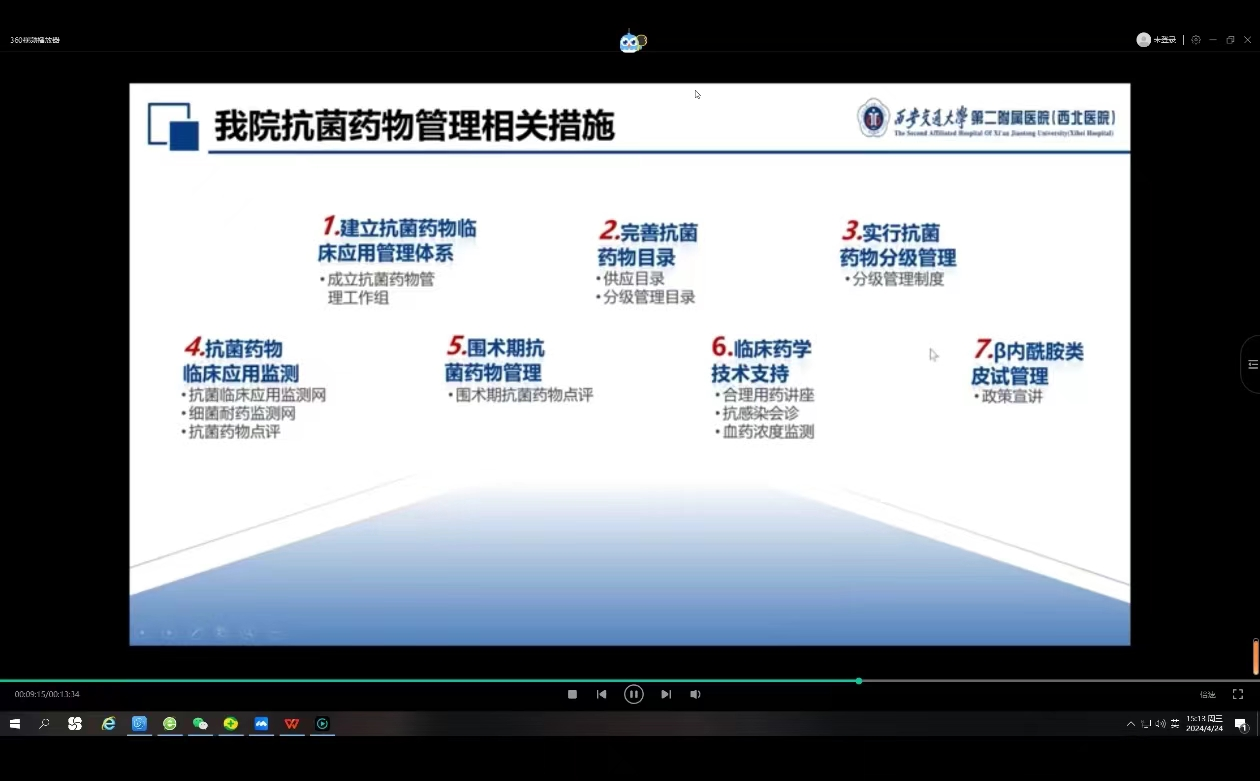 为进一步提升抗菌药物及麻醉、精神类药品、抗肿瘤药物临床应用管理,促进抗菌药物及麻醉、精神类药品、抗肿瘤药物的合理使用,加强患者用药安全,保障医疗质量与安全,4月24日下午,医务部联合药学部举办2024年度医师抗菌药物、麻精药品、抗肿瘤药物处方权授权培训会。全院各临床科室的医生代表参加了本次培训。