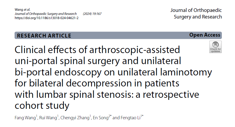 近日,西安交通大学第二附属医院骨科中心—脊柱与骨肿瘤病区在Journal of OrthopaedicSurgery and Research上发表了题为” Clinical effects of arthroscopic‑assisteduni‑portal spinal surgery and unilateralbi‑portal endoscopy on unilateral laminotomyfor bilateral decompression in patientswith lumbar spinal stenosis: a retrospectivecohort study”的研究论文,介绍了关节镜辅助单孔脊柱手术(AUSS)技术在腰椎椎管狭窄症治疗中的应用。