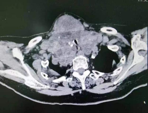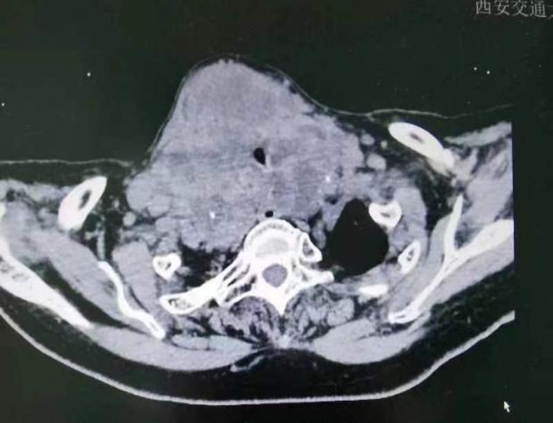 术前影像检查结果显示:气管受到严重压迫