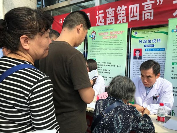 为了更好的帮助群众了解和关注痛风,根据男性高尿酸血症的诊断标准420μmol/L,全国专家把每年的4月20日定为“全民关注痛风日”,为此风湿免疫科、营养科、陕西省护理学会老年专委会内分泌学组于2018年4月20日上午9:00至11:00,以“关注痛风,远离第四高”为主题,开展了“4.20全民关注痛风日”义诊活动。
