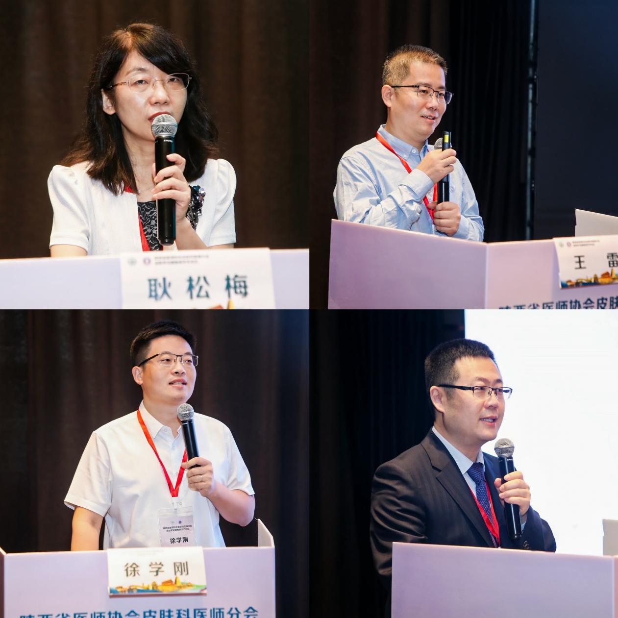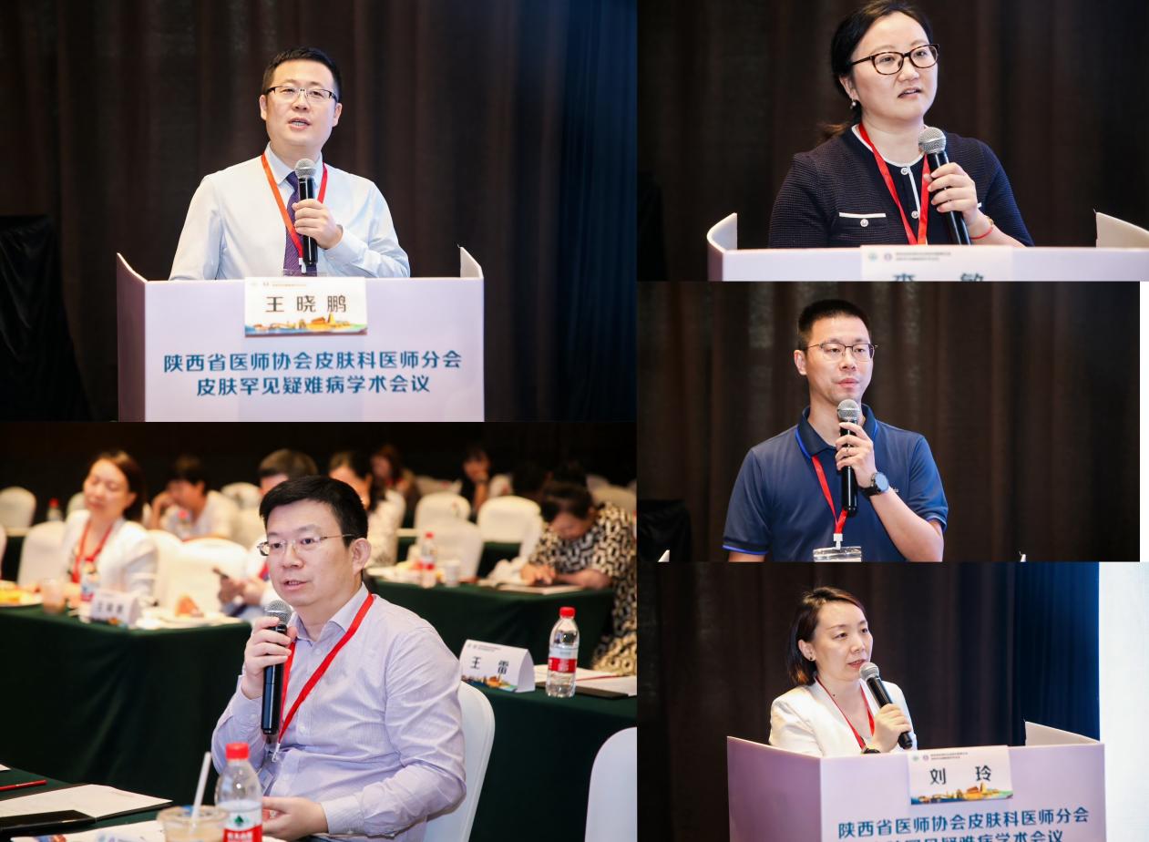会议中,北京大学第一医院皮肤科主任汪旸教授、西安交通大学郭龙教授、国家儿童医学中心、复旦大学附属儿科医院皮肤科主任李明教授、山东第一医科大学附属皮肤病医院孙勇虎教授、陕西省医师协会皮肤科医师分会会长、西安交通大学第二附属医院皮肤科主任耿松梅教授、中国医科大学附属第一医院徐学刚教授、空军军医大学西京医院皮肤病院副主任王雷教授、西安交通大学第二附属医院王晓鹏教授分别从临床队列研究、疾病相关生物信息分析、基础动物模型建立及应用、基因表型关系研究、病理形态学等多个视角出发,分享了其团队在包括皮肤T细胞淋巴瘤、运动系统单基因罕见遗传病、单纯性少毛症、1型神经纤维瘤病、遗传性血管性水肿、银屑病在内等多个领域的研究成果。空军军医大学西京医院皮肤病院副主任王雷教授同汪旸教授对“特应性皮炎与皮肤T细胞淋巴瘤发病的关系”这一话题展开了热烈的讨论,并表达了对其团队成果的高度肯定与期待。同时,陕西省医师协会皮肤科医师分会会长、西安交通大学第二附属医院皮肤科主任耿松梅教授更是从学科建设角度出发,分享了我院对于罕见遗传性皮肤病的诊疗与研究探索。