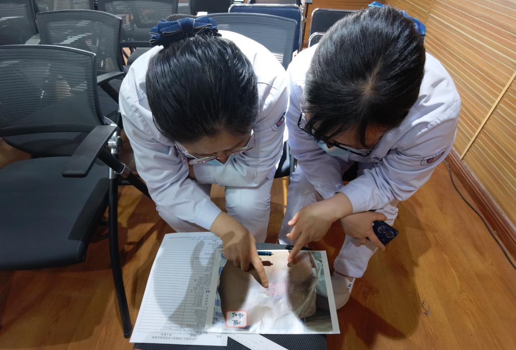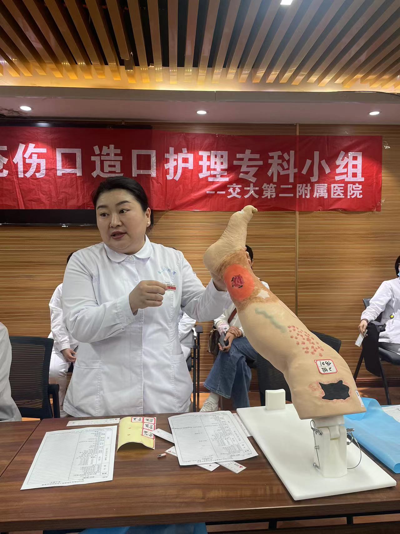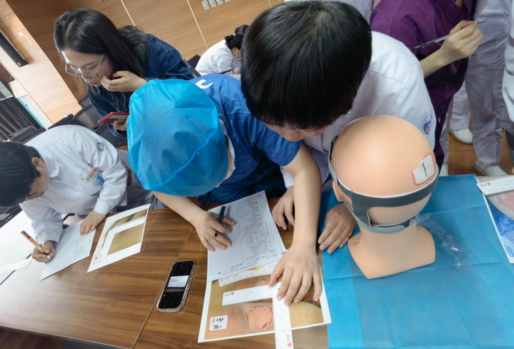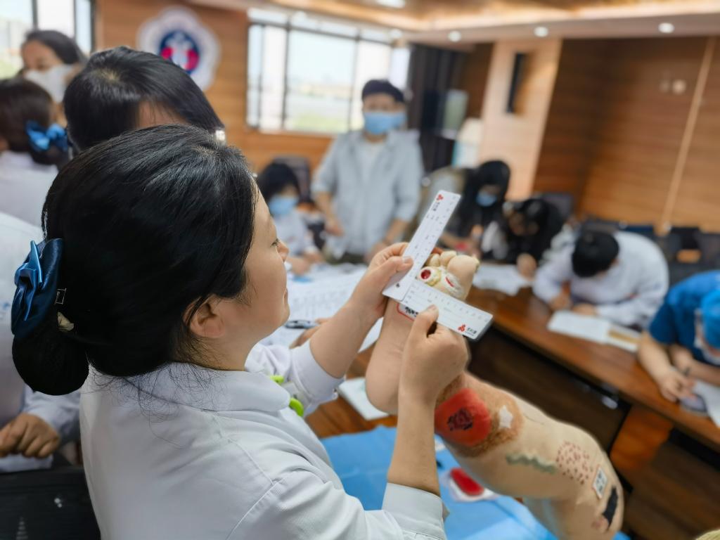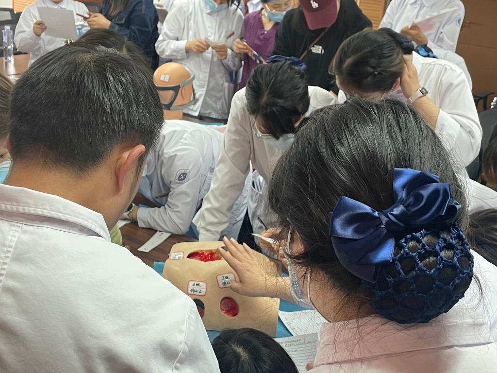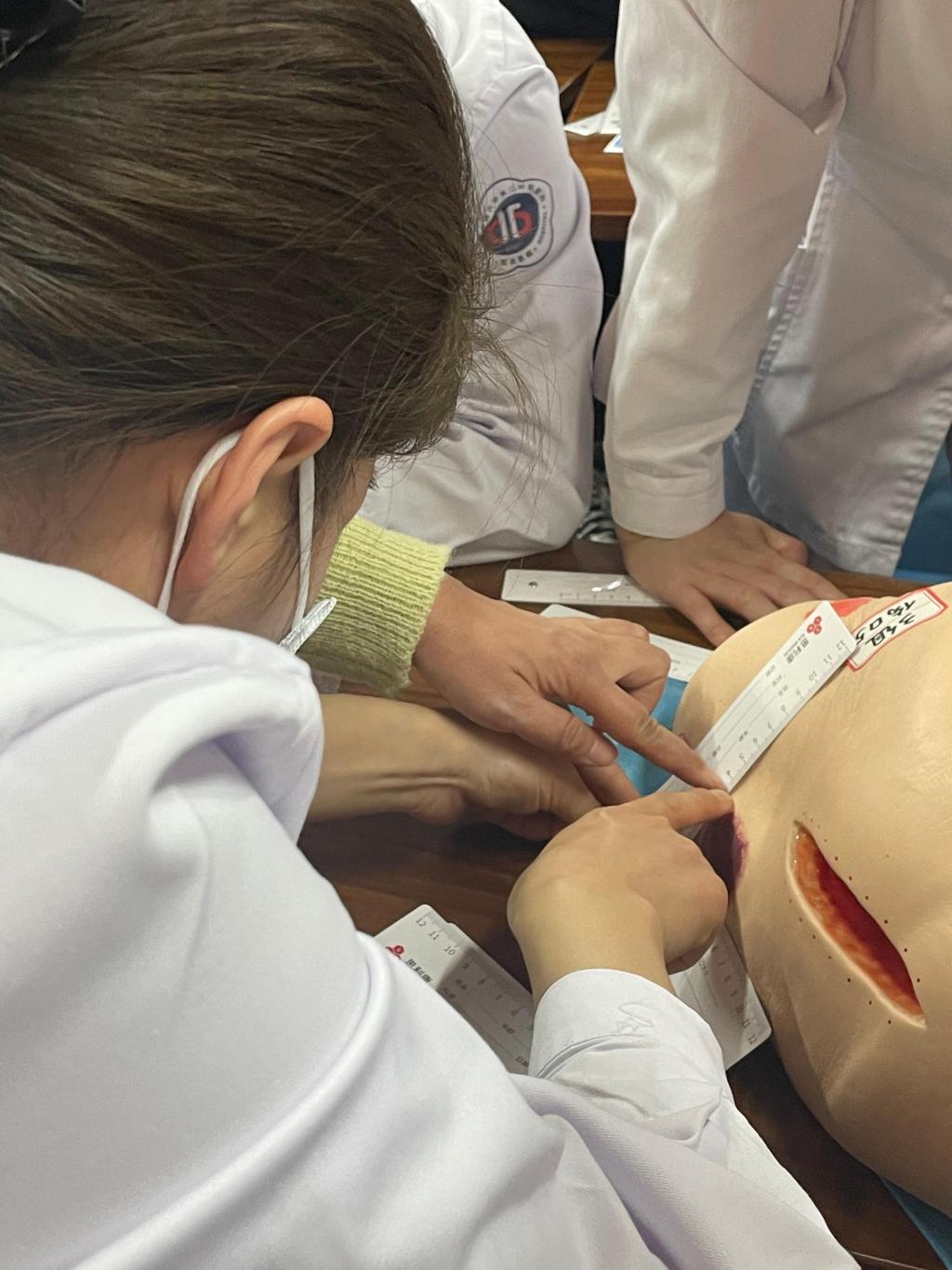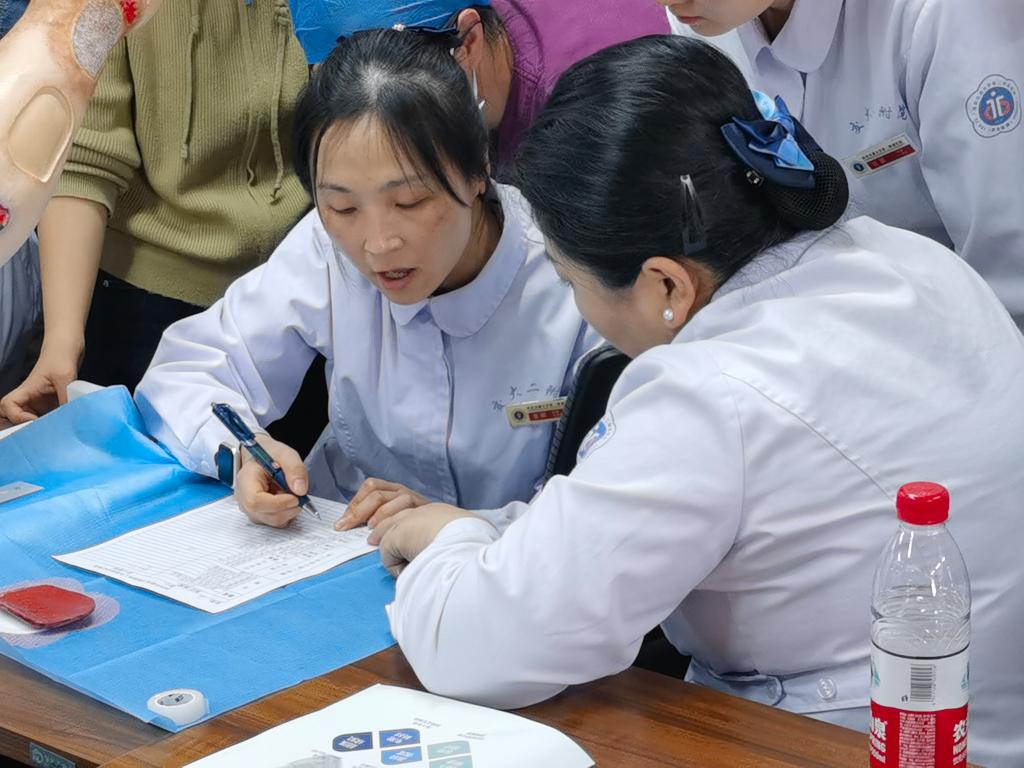 最后是压疮工作坊,各科联络员分为四组,每组有核心成员老师进行压疮伤口识别、分期、测量、描述、处理方法的指导,小组成员经过指导,对自己分发的模拟伤口进行识别、分期、测量、描述、处理等演练并记录。