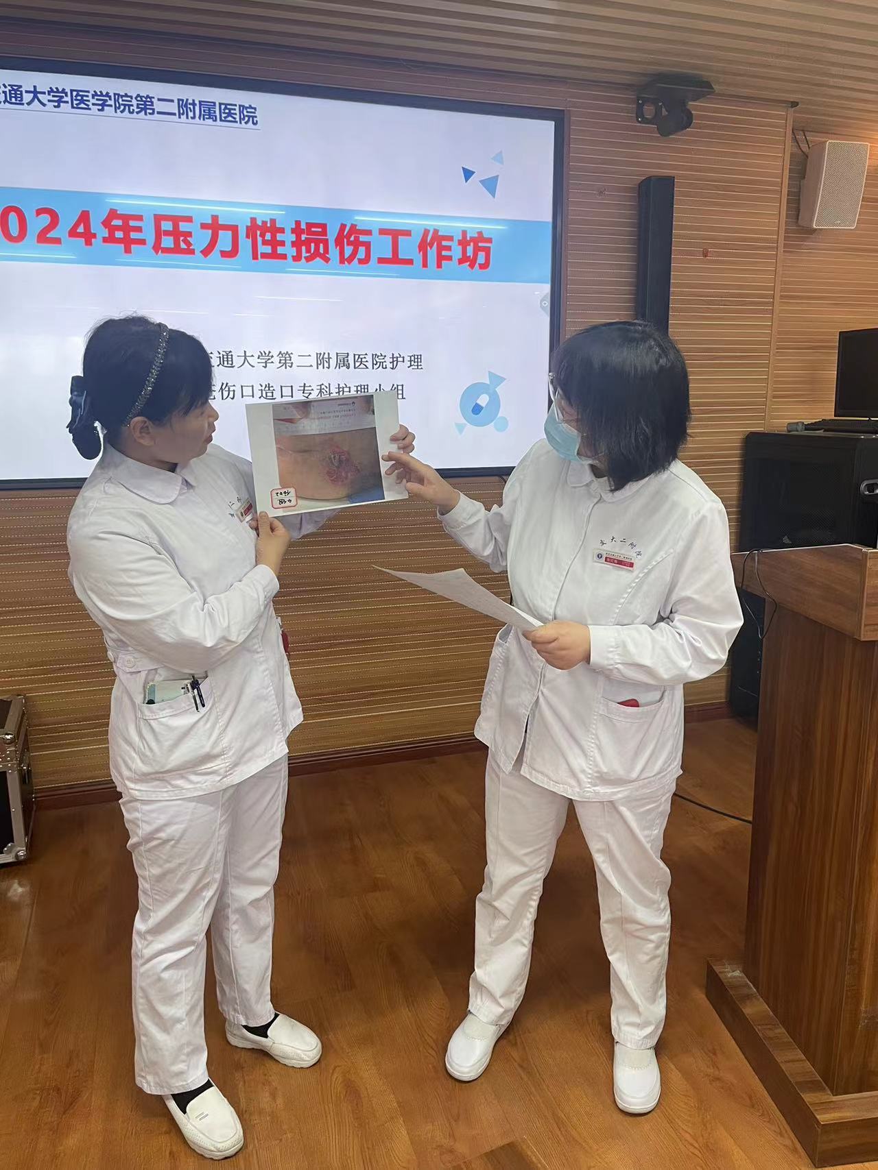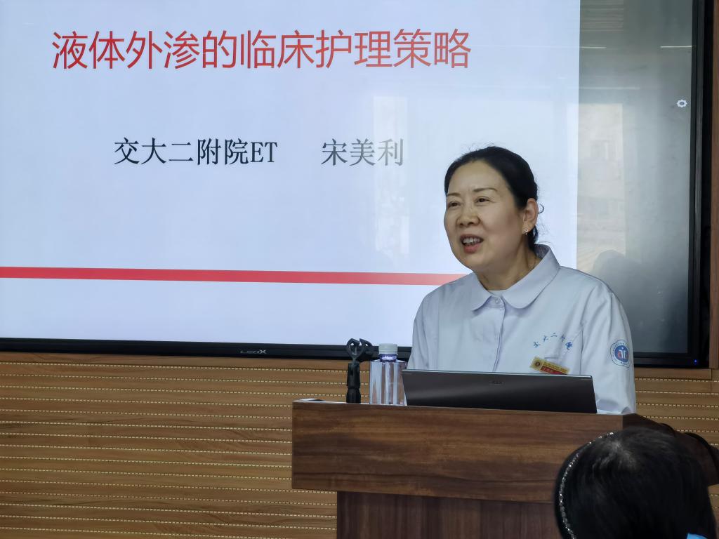 本次会议由两大部分组成:专题讲座和工作坊。首先由脊柱与骨肿瘤病区李珂护士长讲授《器械性压力性损伤患者的管理》,主要从概念、好发部位、高危因素、预防与护理进行讲授,内容简单明了、重点难点突出,贴合临床,大家受益良多;接下来,由门诊换药室宋美利副主任护师讲授《液体外渗的案例分享及处理》,从液体外渗的概念、分类、表现、不同药物致外渗案例的处理方法等进行了详细讲述,使大家充分了解到不同外渗如何进行处理,拓展了知识面。