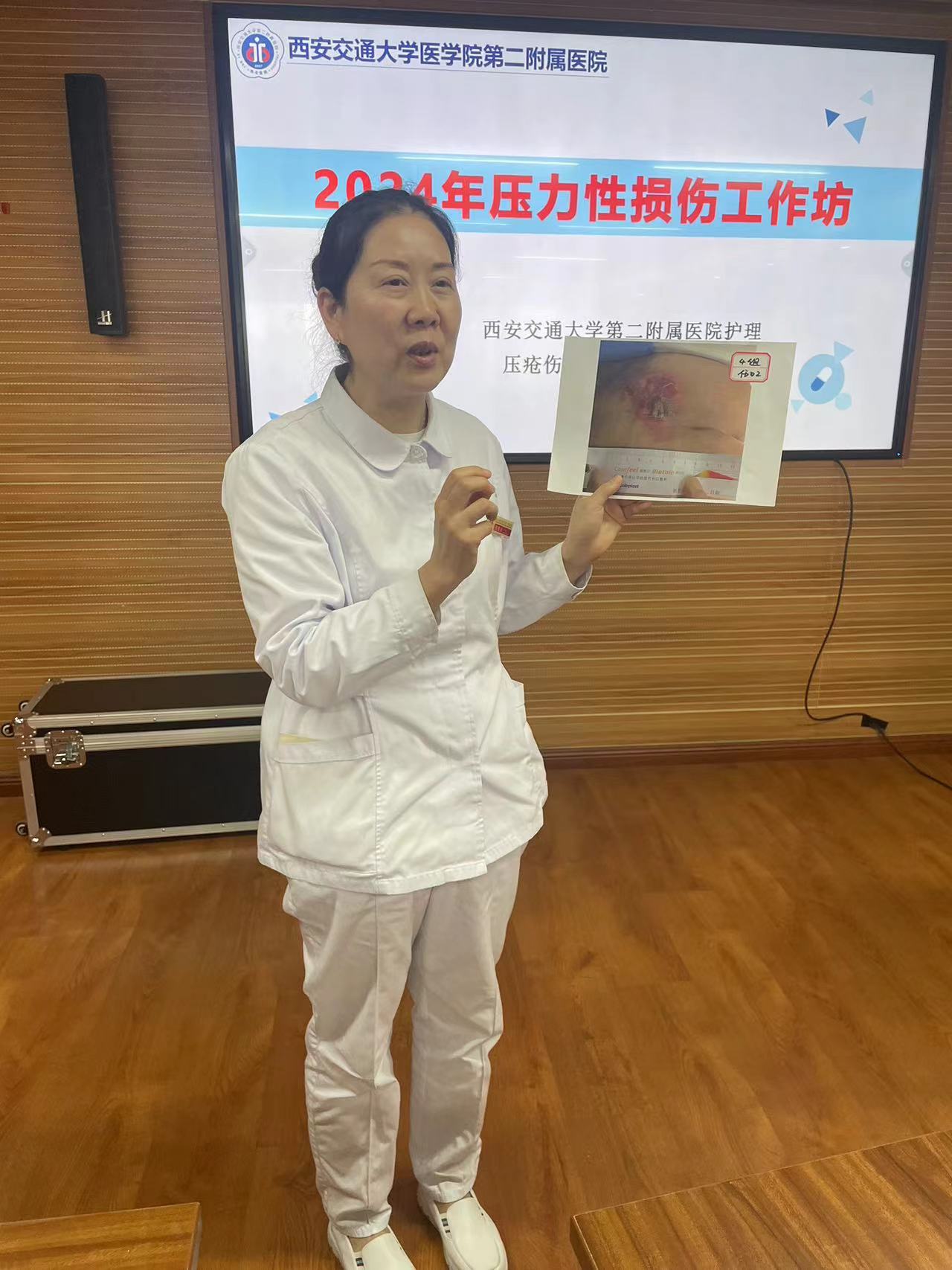 首先,帖迎春副护士长简短的介绍与会嘉宾及参与人员,并指出本次活动是专科小组第二次学术活动,活动经过精心安排,包括压疮及伤口知识讲座和工作坊,望大家认真听讲,积极参与,把授课精神带回科室,提高科室压疮及伤口管理水平。
