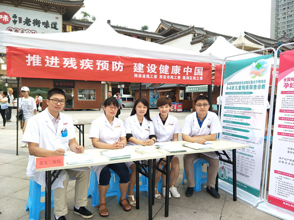 2017年8月25日,是第一个全国“残疾预防日”。陕西省人民政府残疾人工作委员会为贯彻落实中国残联、中央宣传部、中央网等16部委的指示精神,于8月25日上午在西安市莲湖区大唐西市组织开展省直全国第一次“残疾预防日”活动,主题为:推进残疾预防、建设健康中国。西安交大二附院作为残疾预防筛查诊断机构之一也积极参与了活动,参加活动人员包括医务部徐尔迪副主任、小儿内科郭亚乐副主任医师、小儿外科程继文医师、骨二科秦杰医师及耳鼻咽喉头颈外科病院高滢医师等。