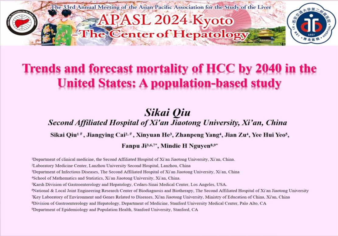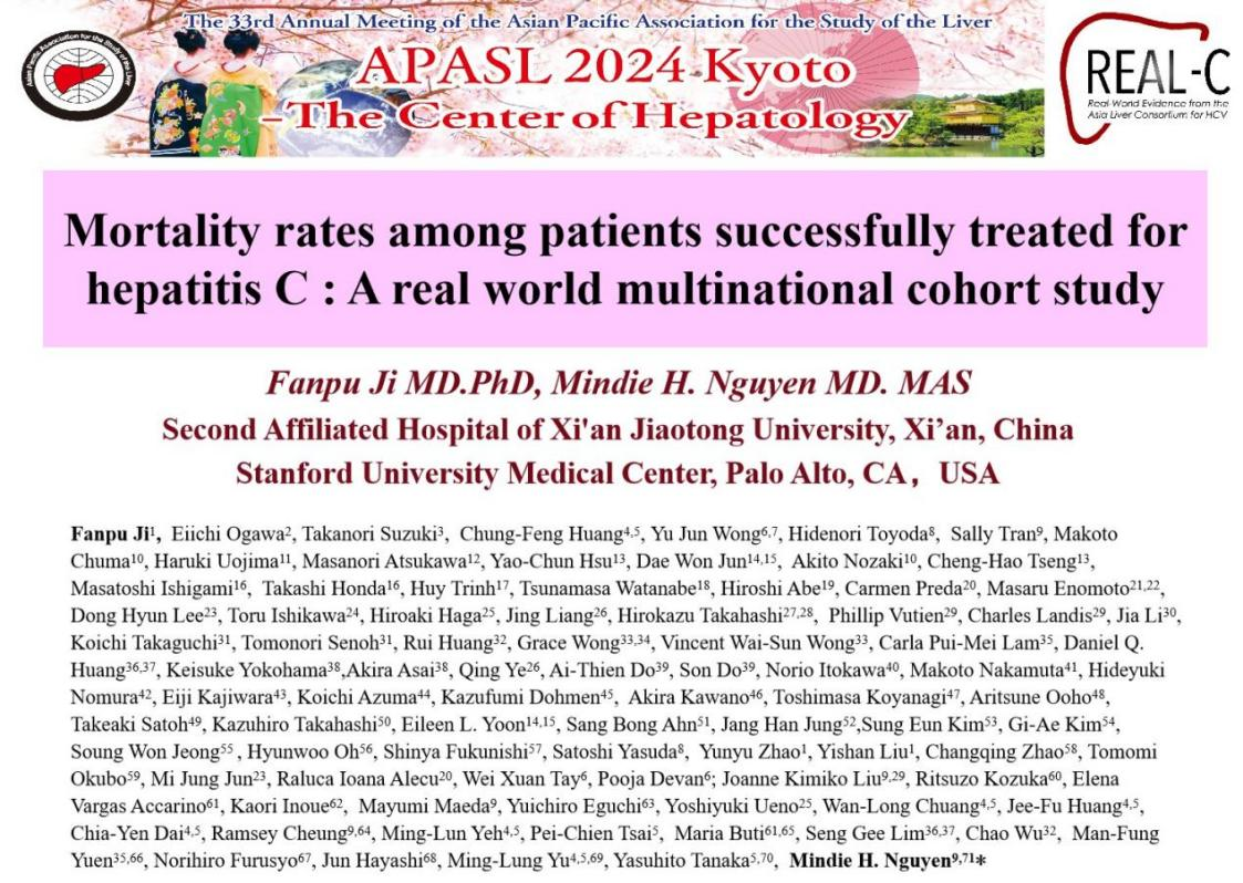 第33届亚太平洋地区肝病学会年会(the 33rd Annual Meeting of the Asian Pacific Association for the Study of the Liver,APASL)于2024年3月27-31日在日本京都举行,该会议是亚太地区肝病学领域顶级国际会议,汇集了肝脏病领域顶级专家近5,000人,研讨内容主要围绕病毒性肝炎、脂肪肝、酒精性肝病、自身免疫性肝病、肝硬化门脉高压症、肝脏肿瘤、胆道疾病和肝移植等领域开展。此次我院感染科纪泛扑教授团队四项研究被接收为口头报告,包括两项HCC领域最新研究,聚焦在老年晚期HCC靶免治疗,以及HCC死亡趋势和2040年死亡率预测;同时还包括2项国际多中心的丙型肝炎真实世界研究成果,聚焦于DAA治疗及预后的研究。