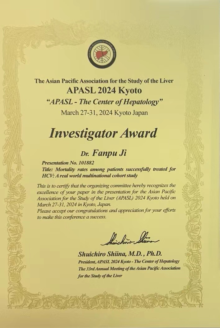 四项研究之一《Mortality rates among patients successfully treated for hepatitis C: A real world multinational cohort study》获得2024 APASL 研究者奖。该研究是基于在斯坦福大学访问学习期间与Mindie Nguyen教授形成的长期紧密合作关系,围绕REAL-C队列开展的国际多中心研究。研究纳入10,034 名成功治疗 HCV 的患者在其清除病毒获得持续病毒学应答(SVR)后平均随访4.7 年,分析全因死亡率以及肝脏和非肝脏相关死亡率。结果显示,总体人群全因死亡率为每 1000 人年 10.4 人,无肝硬化、代偿期肝硬化和失代偿期肝硬化患者每 1000 人年全因死亡率分别为 6.2 人、13.1 人和 60.0 人。在多变量分析中,年龄较大(>65岁:3.25倍)、男性(1.5倍)、纤维化严重程度(失代偿/代偿期肝硬化为7.6/1.8倍)、基线糖尿病(1.53倍)、非亚裔(2.12 倍)与死亡率升高显著相关。对于DAA治疗获得SVR 的非肝硬化、代偿期和失代偿期肝硬化患者,8 年估计累积死亡率分别为 6.0%、11.6% 和 47.7%。本研究表明,DAA治疗获得SVR的患者面临不同的死亡风险,其中死亡风险与 DAA 治疗前肝病严重程度密切相关,上述结果为HCV治愈后个体化随访患者提供理论依据,将助力WHO实现2030年消除HCV的目标。