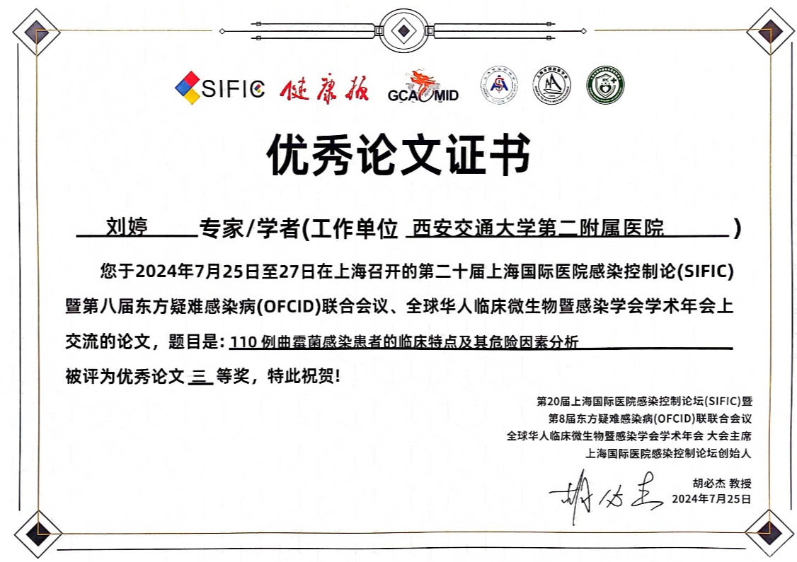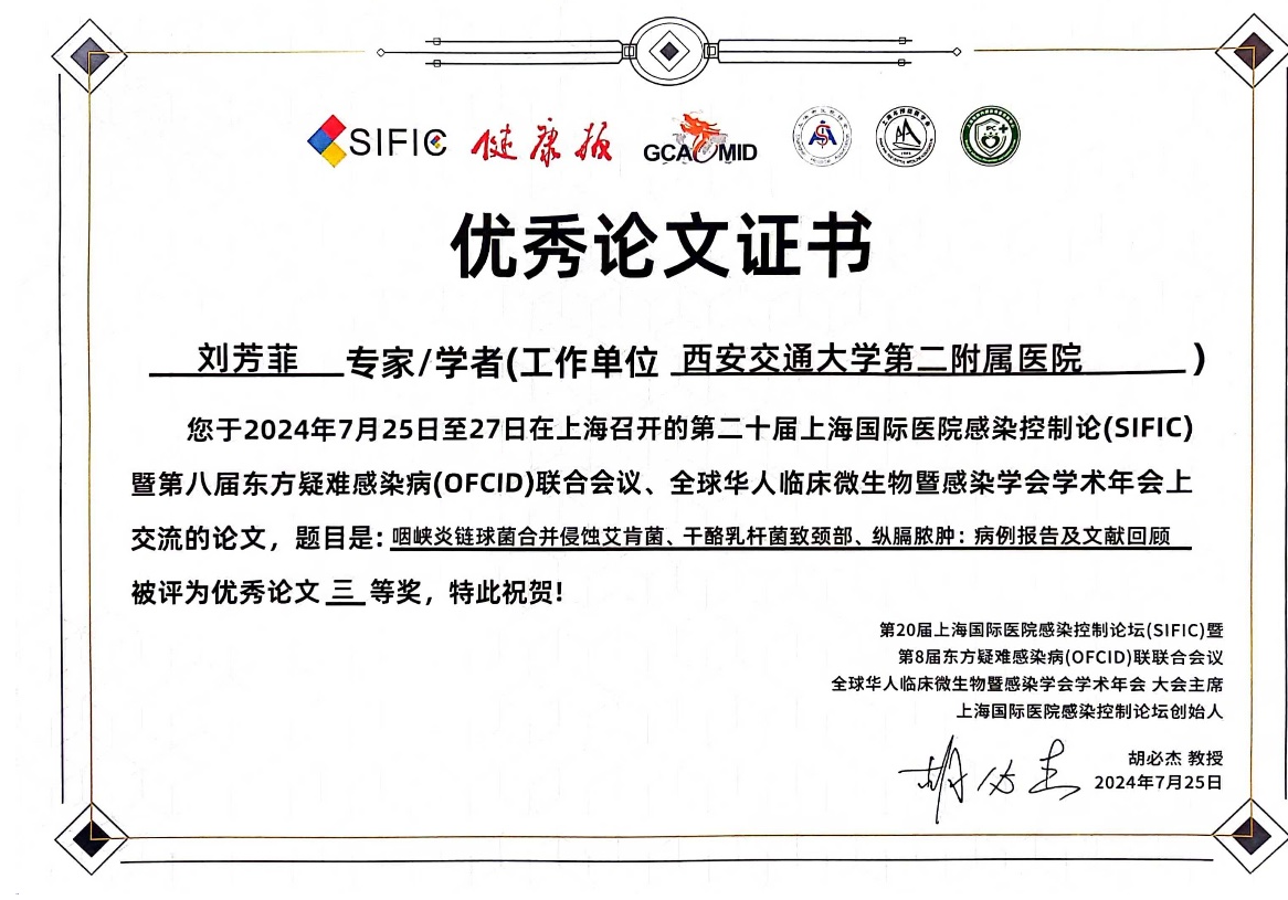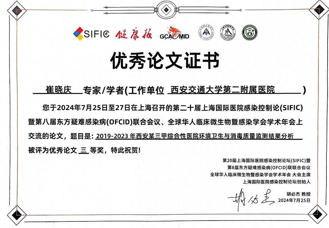 此次大会院感办团队报送的7篇学术论文均入选现场壁报交流环节。其中刘芳菲论文《咽峡炎链球菌合并侵蚀艾肯菌、干酪乳杆菌致翼下颌、颈部、纵隔脓肿》、刘婷论文《110例曲霉菌感染患者的临床特点及其危险因素》、崔晓庆论文《2019-2023年西安某三甲医院综合性医院环境卫生与消毒质量检测结果分析》获得大会优秀论文三等奖殊荣。