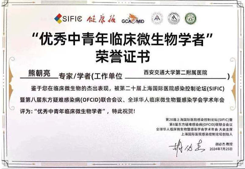为推动我国感控事业实现更高质量发展,通过“感染-感控-微生物”多学科有机融合,实现“价值感控、循证感控、精准感控、个体化感控”理念全面落地临床,今年的SIFIC联合会议组织了2024年度“优秀中青年临床微生物学者”全国评选活动。院感办作为管理职能部门积极推进人才培养与推广工作。通过院内审查,推选检验科熊朝亮博士参加全国遴选。最终,全国50名中青年临床微生物学者通过层层遴选入围。熊朝亮博士凭借个人优秀工作能力获得“优秀中青年临床微生物学者”殊荣。