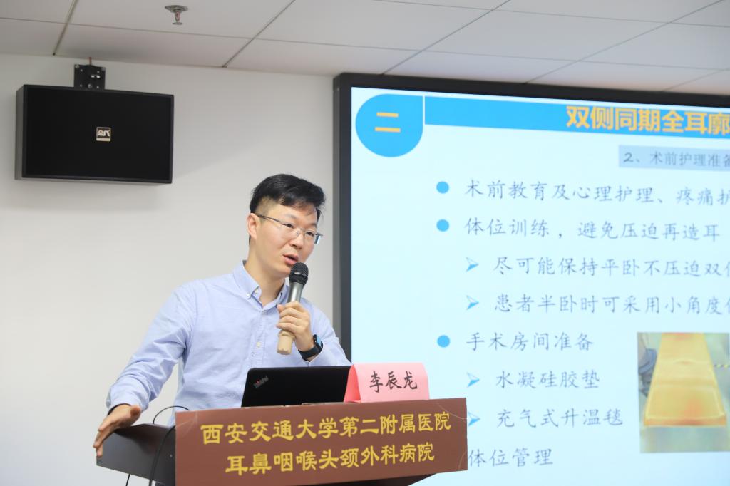 学术环节由西安交大二附院耳鼻咽喉头颈外科高滢副教授主持,首先由张天宇教授分享了耳畸形功能重建与美学再造的实践与展望。张教授从耳结构形态学及功能学出发,着眼于眼耳鼻喉科功能重建与整形发展,提出了眼耳鼻喉学科从功能学重建到审美学完善的社会医学发展需求,强调眼耳鼻喉学科、整形学科等多学科交叉融合的重要性与必要性,为耳鼻喉学科的进一步专科化、学术化、人文化全面发展提出了宝贵建议。李辰龙教授结合具体的临床病例,分享了近年来双侧同期全耳廓再造术的治疗经验,介绍了双侧同期耳廓再造的围术期护理要点以及手术的操作要点,展现了精湛的手术技巧和精细的围手术期管理。