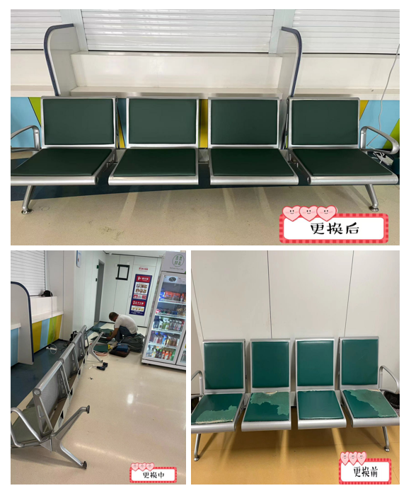 创建优美、舒心的门诊环境,可以从一定程度上缓解患者在就医过程中的焦虑感,同时整齐洁净的诊室环境也可缓解医师们的接诊压力。患者和医生在好的心理状态下,更能够促进相互间对病情的沟通,有利于疾病的诊疗。为此,门诊部延续2023年“树标立范”门诊诊室样板间竞赛活动,将活动中的好经验、好想法进行成果转化,与后勤保障部协作于5月份再次开展门诊诊区真是环境优化工作。对诊区诊室进行了全面的清洁清理,并制定诊室整理清洁统一标准,对各区域保洁员进行培训。同时,对候诊区内有破损的候诊椅进行了统一维修、更换。门诊整体环境焕然一新。