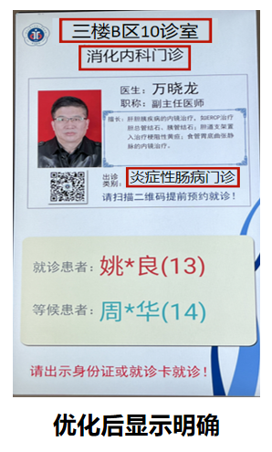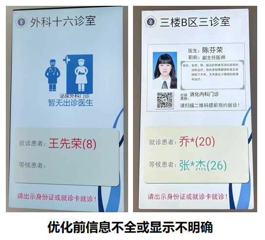 门诊诊室门旁叫号屏是门诊挂号信息、医生基本信息以及就诊排序信息的直接体现。尤其是叫号屏上门诊诊室名称、医生出诊门诊名称的信息,需与挂号凭证信息直接对应,如出现差异,变会给患者寻找就诊位置带来不便。为此,门诊部首先对门诊诊室名称进行了梳理,按照统一规范重新命名门诊所有诊间,并与信息网络部、HIS系统/叫号系统/自助机工程师多次协调沟通,确定最终版本,对叫号屏进行全面优化。